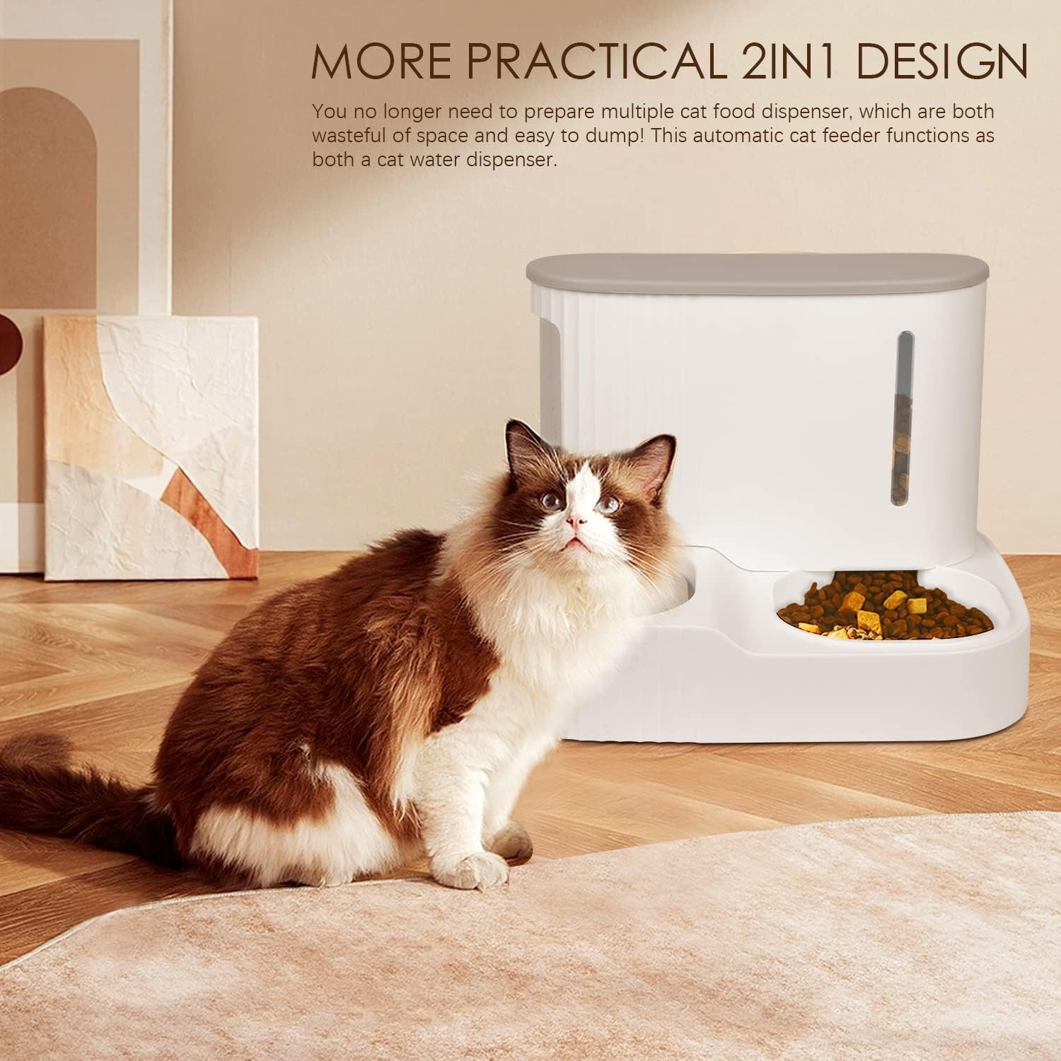 More Practical 2 In 1 Design: You no longer need to prepare multiple cat food dispensers, which are both wasteful of space and hard to dump! This automatic cat feeder functions as both a cat water dispenser, it can hold 4/5 gallons of dry cat food and 1/5 gallon of water for cats or small dogs.