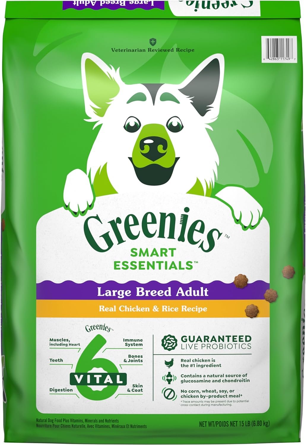 The Greenies brand is on a mission to promote your dog’s well-being from teeth to tail! Greenies Smart Essentials Adult Large Breed High Protein Dry Dog Food Real Chicken & Rice Recipe offers science-backed nutrition with an irresistible taste. This nutritious dry dog food for large breed adult dogs features real chicken as the #1 ingredient and is designed to help support 6 key areas of your dog’s health: digestion, immune system, teeth, skin & coat, bones & joints, and muscles, including the heart. Greenies Smart Essentials Adult Large Breed Dry Dog Food is formulated without corn, wheat, soy, or chicken by-product meal, and no artificial flavors or preservatives*. With a natural source of glucosamine and chondroitin and made with natural ingredients plus vitamins, minerals, and nutrients, Greenies Smart Essentials Adult Large Breed High Protein Dry Dog Food is guaranteed to bring joy to mealtime with tail-wagging flavor. Love it or your money back! *Trace amounts may be present due to potential cross-contact during manufacturing