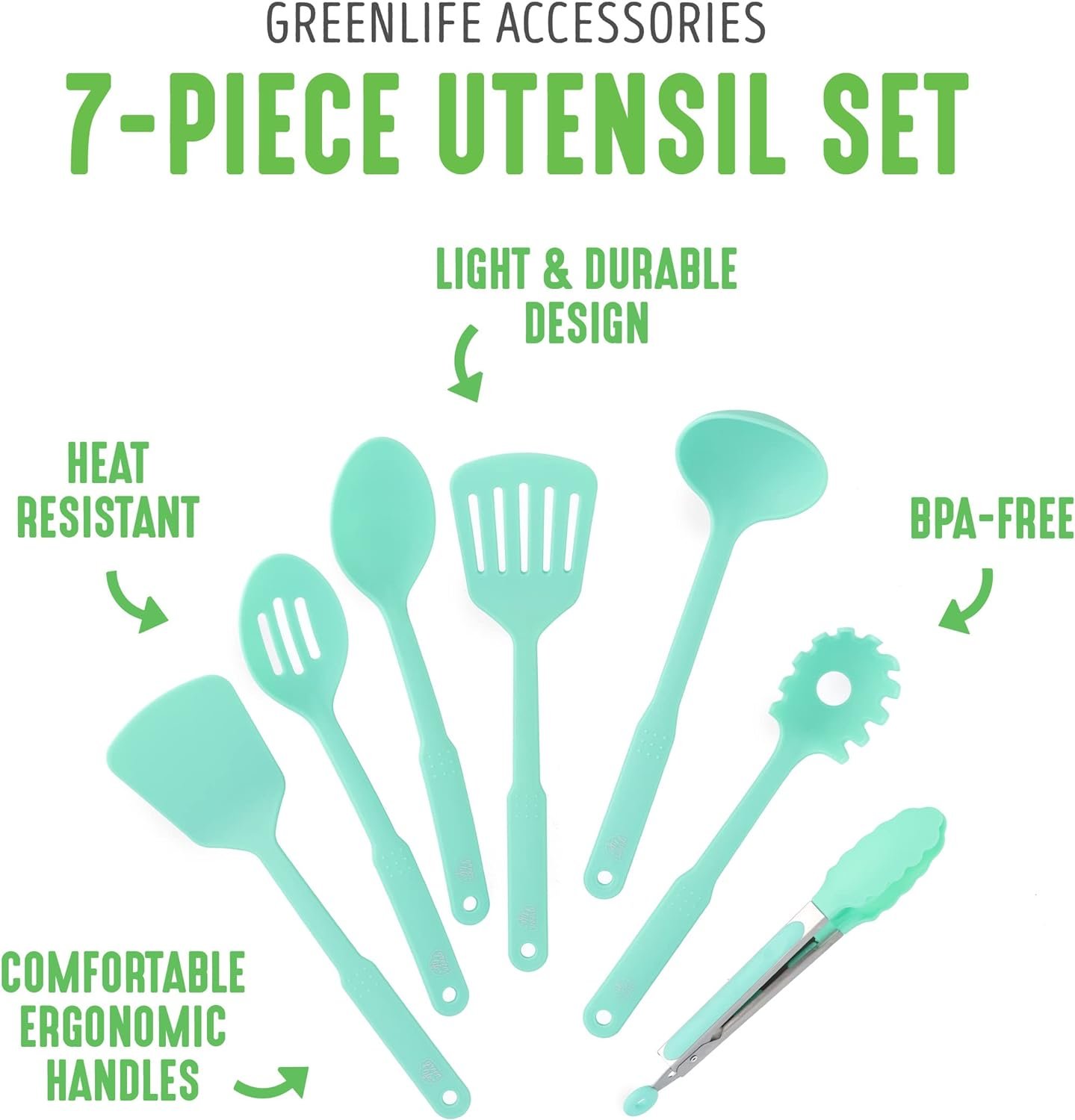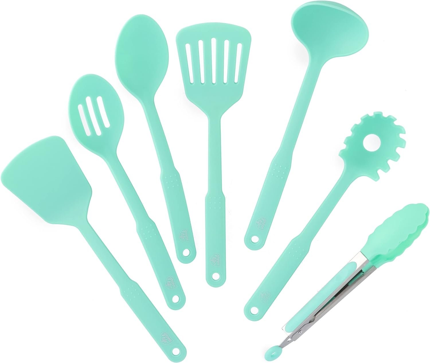 GreenLife Cooking Tools and Utensils, 7 Piece Nylon Set including Spatulas Turner Spoons and Tongs, Dishwasher Safe, Turquoise