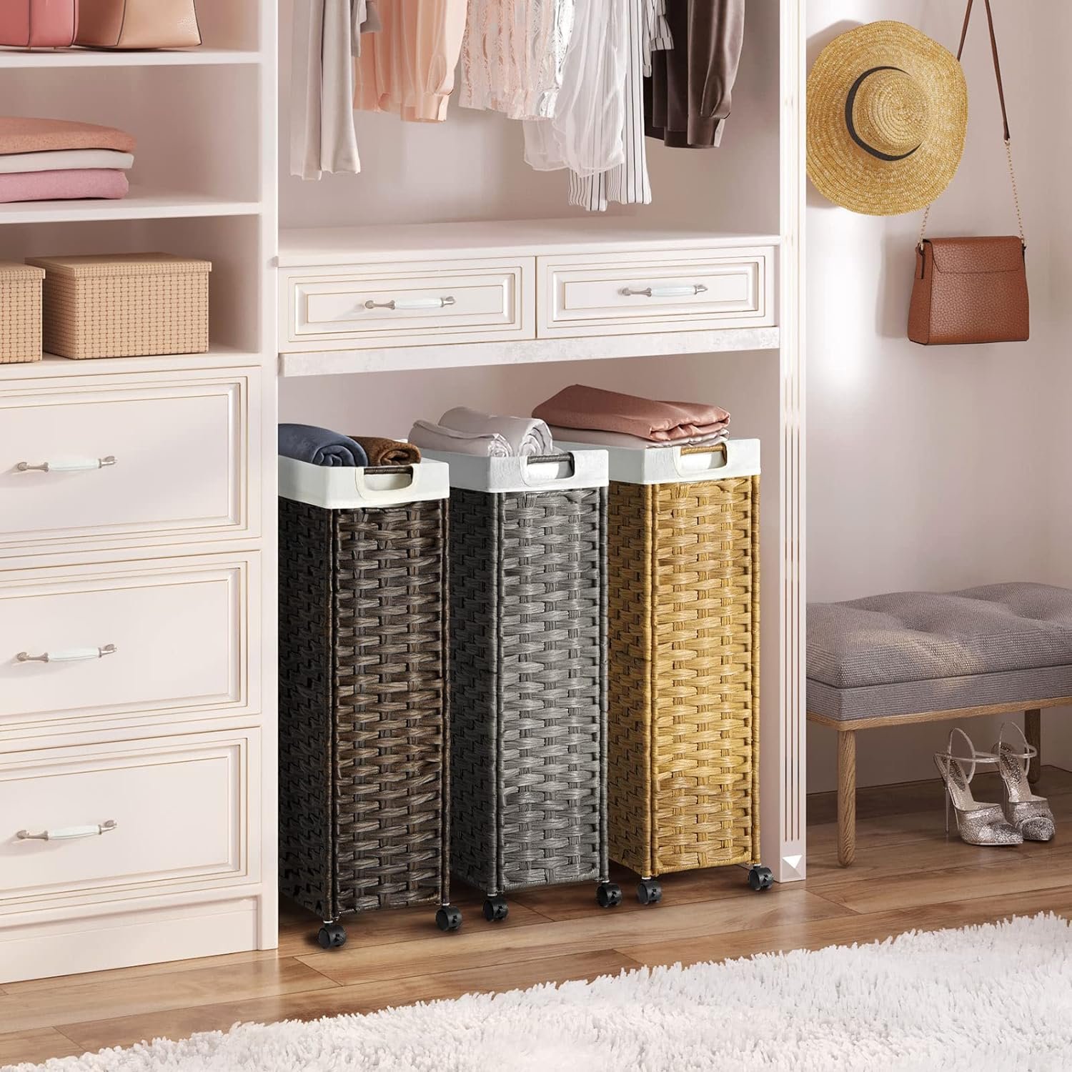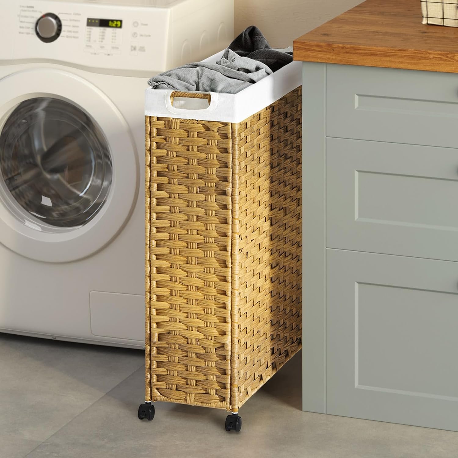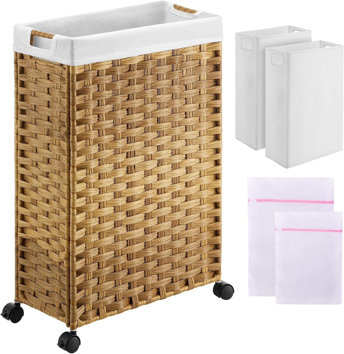 Greenstell Laundry Hamper with Wheels, 30L Slim Laundry Basket with 2 Removable Liner Bags & 2 Mesh Bags, Narrow Dirty Clothes Basket, Handwoven Rattan Organizer in Bathroom, Bedroom, Natural