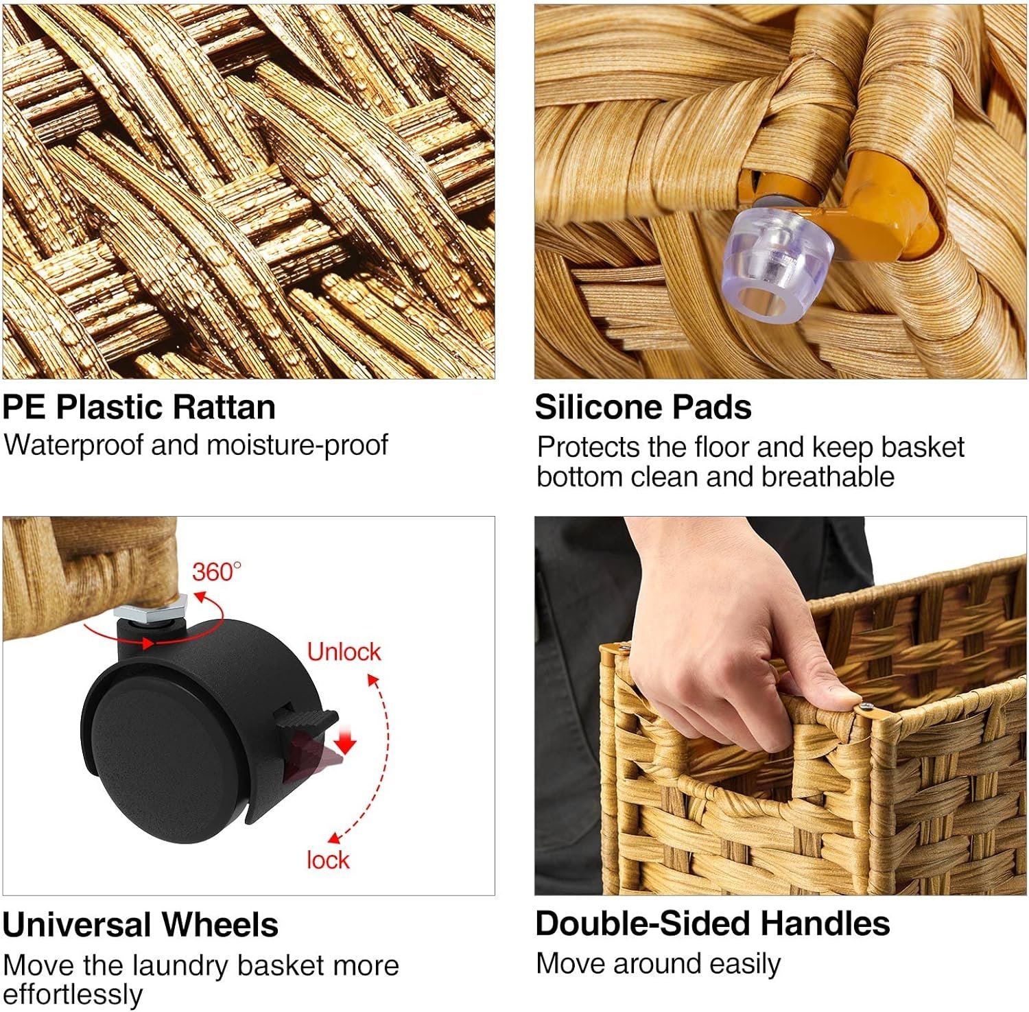 Light & Sturdy – The metal frame support makes the laundry basket with wheels more sturdy and durable, and the hand-made rattan weaving also makes the product stronger than the traditional fabric materials which is easy to deform and have creases. The synthetic rattan materials are lightweight and easy to carry.