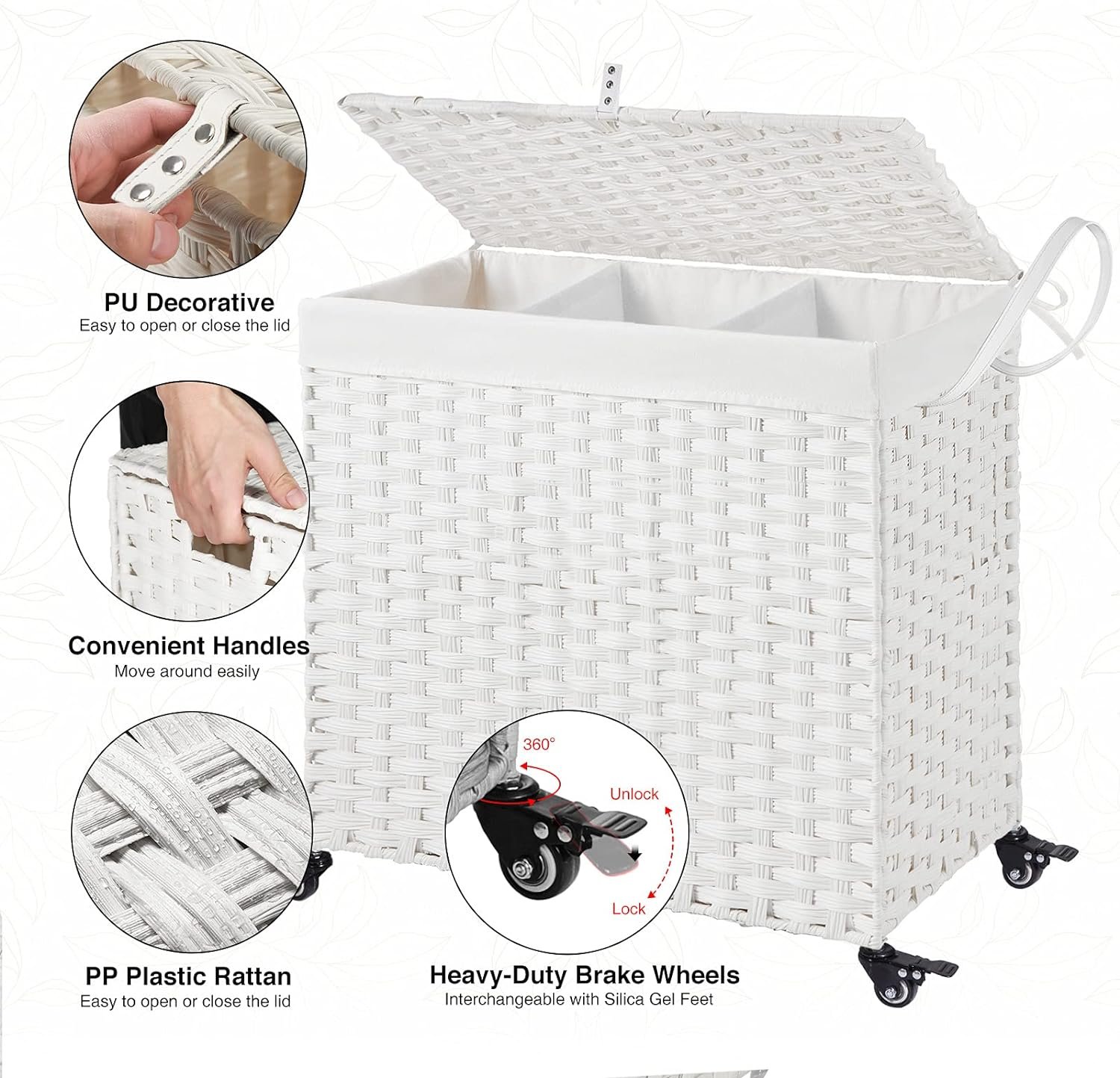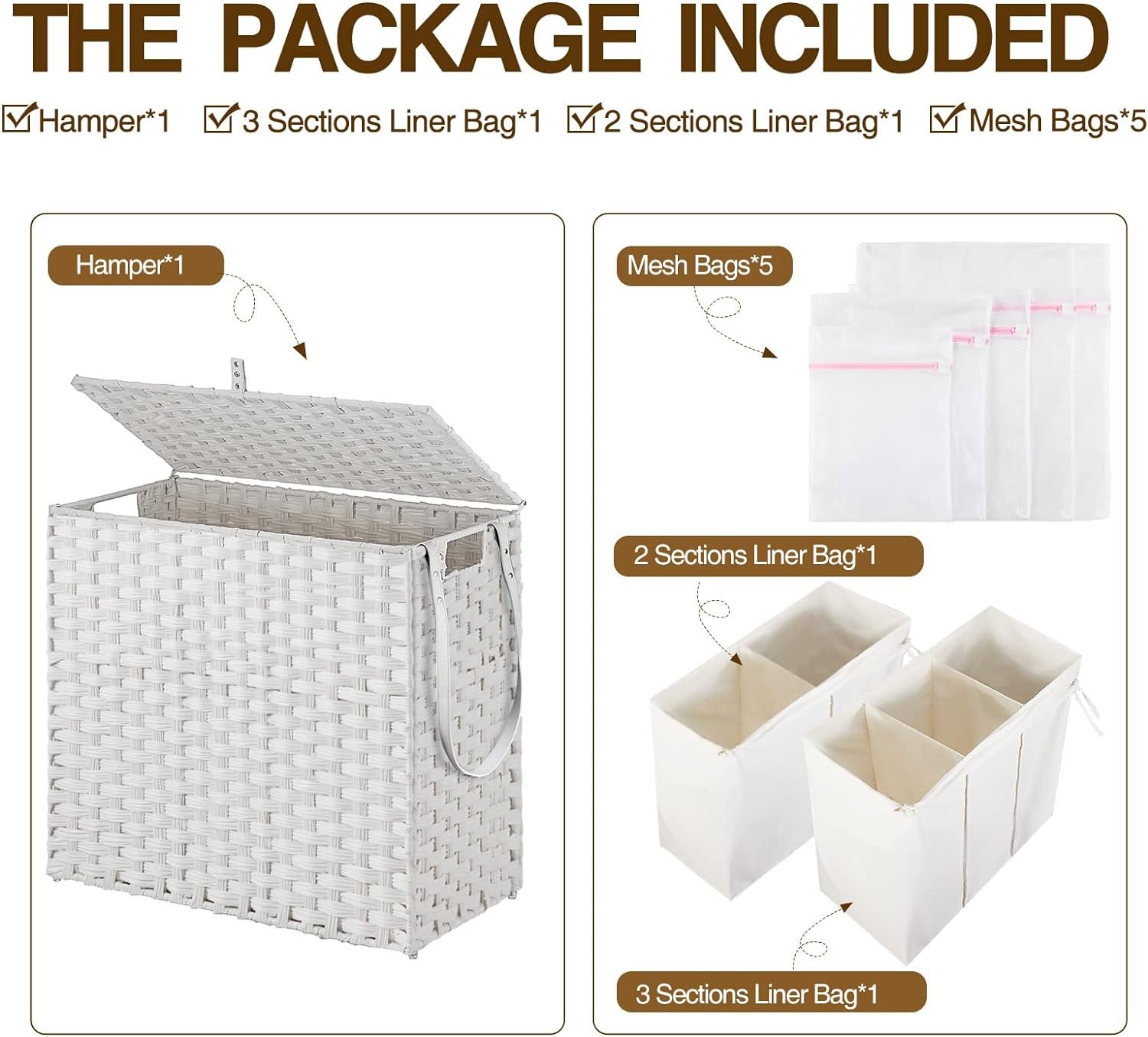 Wide Inner Space – 2 types of liner bag of different specifications – 2-section liner bag can hold larger pieces and more clothes in each grid, 3-section liner bag can easily sort clothes of different colors. The thickened wire frame on the laundry basket improves load bearing capacity and leaves more space inside. Added PU decorative handles, make it easy to open the hamper lid to put the dirty clothes into the basket, keeping your room tidy and clean