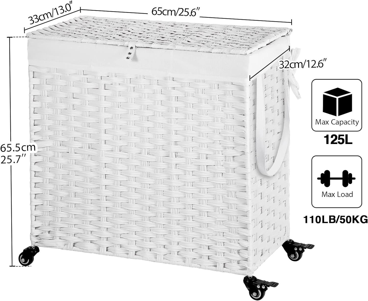 Easy to assemble, large capacity – Convenient tools are equipped for easy installation. Large capacity 125L size: 25.6 (L) x 13.0 (W) x 25.7 (H) in. The laundry basket with double-sided Inscribed handle can easily move blankets, towels or daily clothes among different rooms. The maximum load capacity is 110LB