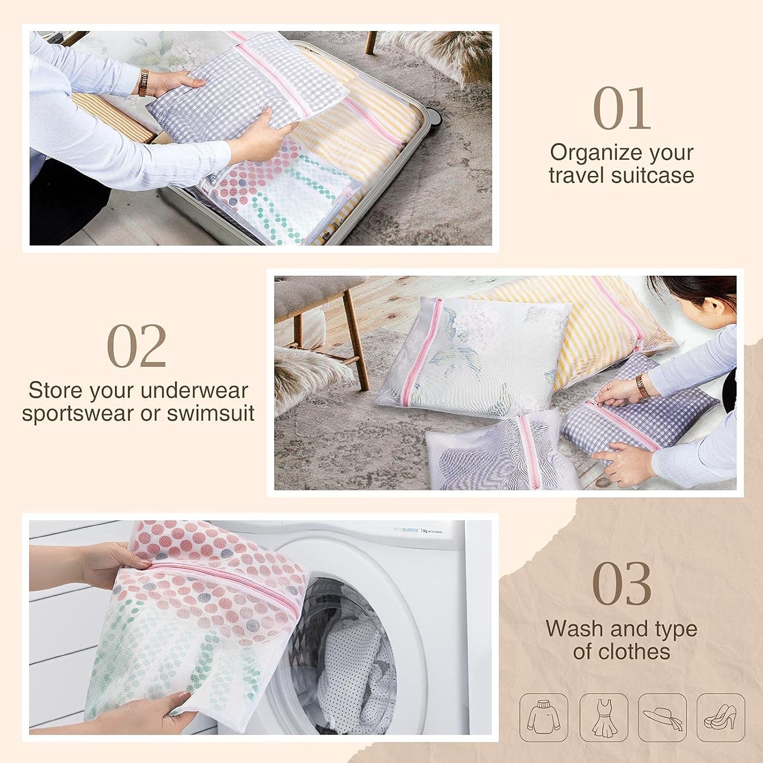 Detachable and Washable Linings & Mesh Bags – Each laundry hamper with lid is equipped with 2 detachable liner bags, so the clothes can be conveniently taken out from the basket and transported to the washing machine. The 2 liner bags are convenient to move, wash and replace. The hamper lid hides the smelly clothes while keeping the dirty clothes invisible. 5 mesh laundry bags make washing easier and cleaner, which are suitable for bath towels, coats, jeans, underwear, socks and so on