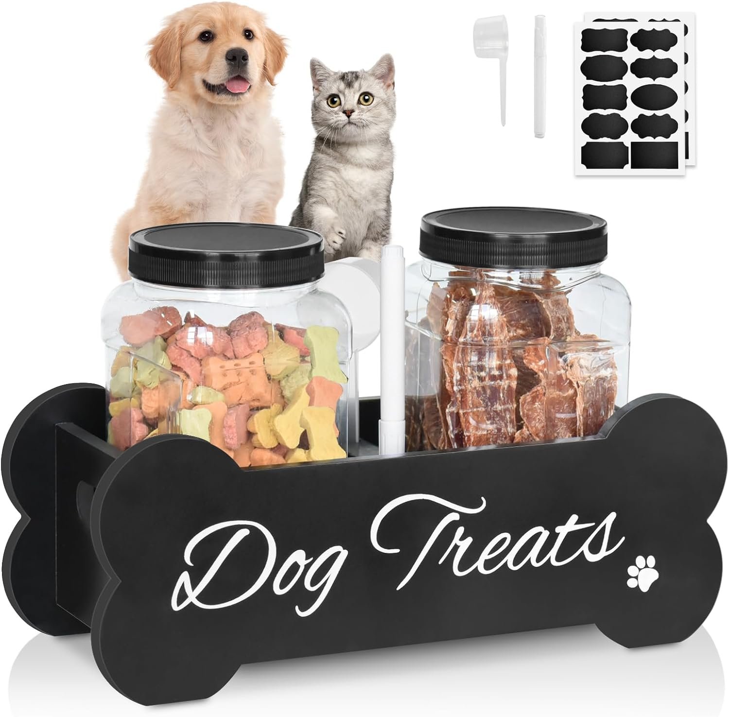 【DURABLE AND LARGE CAPACITY】Our dog treat containers are made of strong and durable solid wood with handles on both sides for easy movement. The 2 sealed dog treat jars are7″x4″ /1400ML in size and have enough capacity to hold cookies, snacks, food and other dog favorite foods. The transparent bottle allows you to keep an eye on the changes in the food, and the large mouth design allows you to easily put in and take out treats. Your pets will love this cat food container.