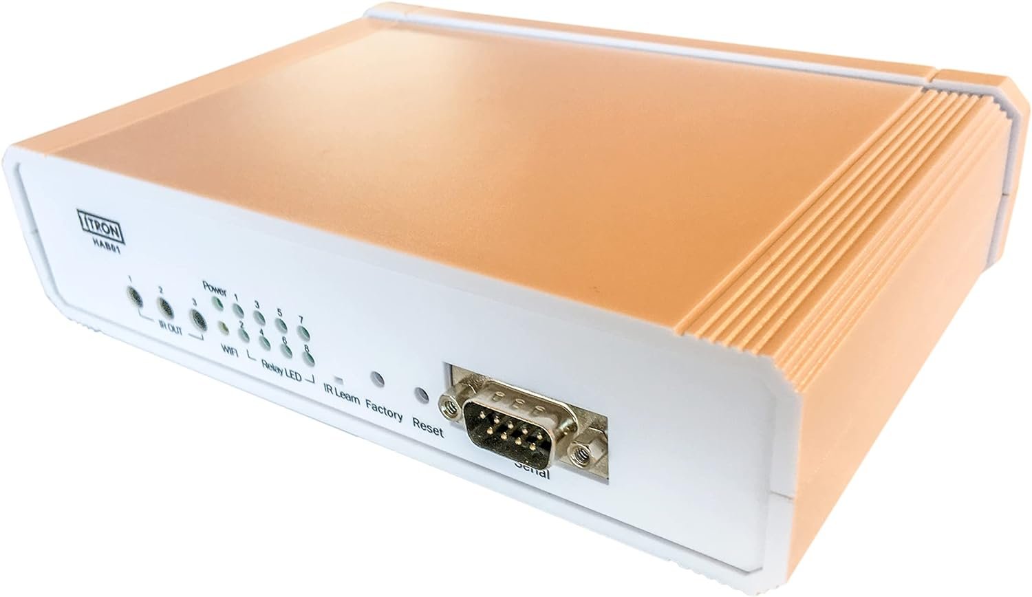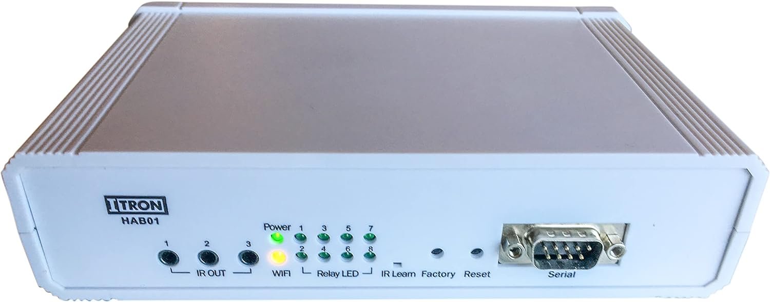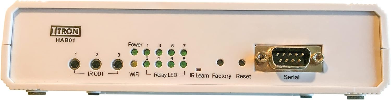 iTron HAB IP Home Automation Bridge. The device connects via Ethernet or Wi-Fi and provides a high level of automation and control flexibility, enabling device in homes or office to be controlled. This includes TV’s, Set Top Boxes, Projectors, AV Systems, Lighting, Curtains & Blinds. This gives you plenty of options to be creative with your home & office automation. PHYSICAL Height : 46mm Width : 180mm Depth : 134mm POWER Optional PoE: Min 24W POE required Mains: 6V – 18V DC 2A CONNECTIVITY Ethernet : 1 RJ45 (Optional POE) Wi-Fi : 802.11 a/b/n USB: Used for brick mode firmware recovery FRONT PANEL Power indicator: Red LED indicates board is powered Wi-Fi Status: Orange LED indicates Wi-Fi Status IR OUT [1-3] : 3.5mm output for IR transmitter Relay LED [1-8]: Red LED indicates status of each relay IR Learn: IR Inputs for learning IR codes Factory : Factory Button Reset: Reset Button Serial: DB9 Male serial RS232 connector REAR PANEL Power :5mm Barrel Jack , 2.1mm center opin USB: USB-A Connector LAN: RAJ-4510/100Mbps Relay & connector 8XSPDT Relay’s with screw terminal connector PACKAGE INCLUDES 1x Global Adapter (90-240V) / 12V DC 3 X 2.5mm IR cable (1m long) 1 X iTron HAB01 unit