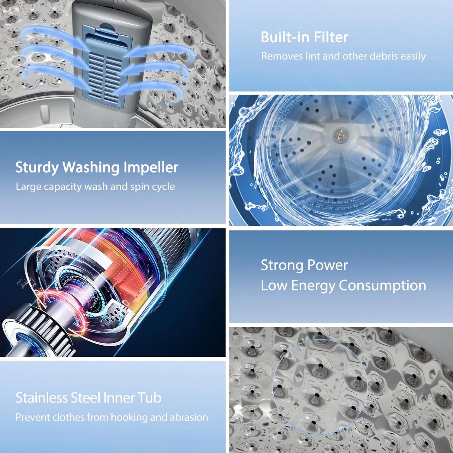 🧺【Thorough Cleaning & Spinning Cycles】260W Washing Power and 230W Spinner Power. 360° tumbling washing easily gets rid of stubborn stains and provides optimal cleaning and rinsing performance. Press the button of “Program/Delay” at the same time 3 seconds to turn on the delayed wash function. Save you a lot of hassles. It is your good helper!