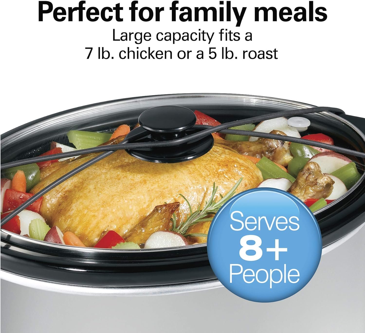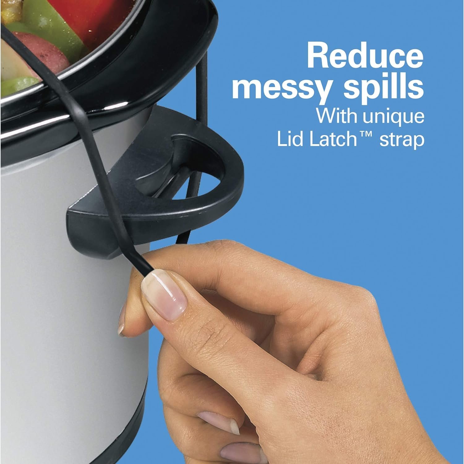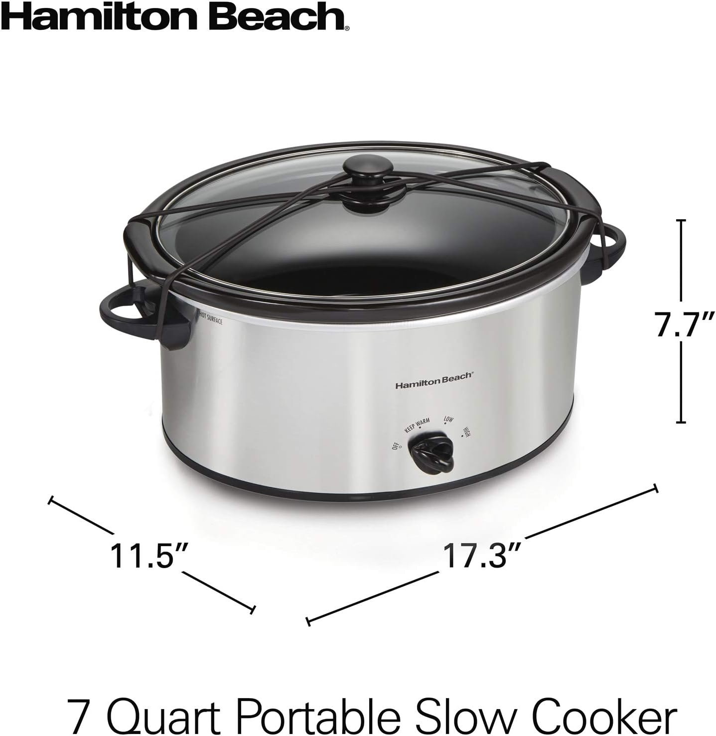 The Hamilton Beach® 7 Quart Portable Slow Cooker has a Lid Latch™ strap that attaches to the handles to reduce messy spills. It holds a 7 lb. chicken or 5 lb. roast and serves 8+ people. It’s simple to use and has a dishwasher safe crock and lid.
