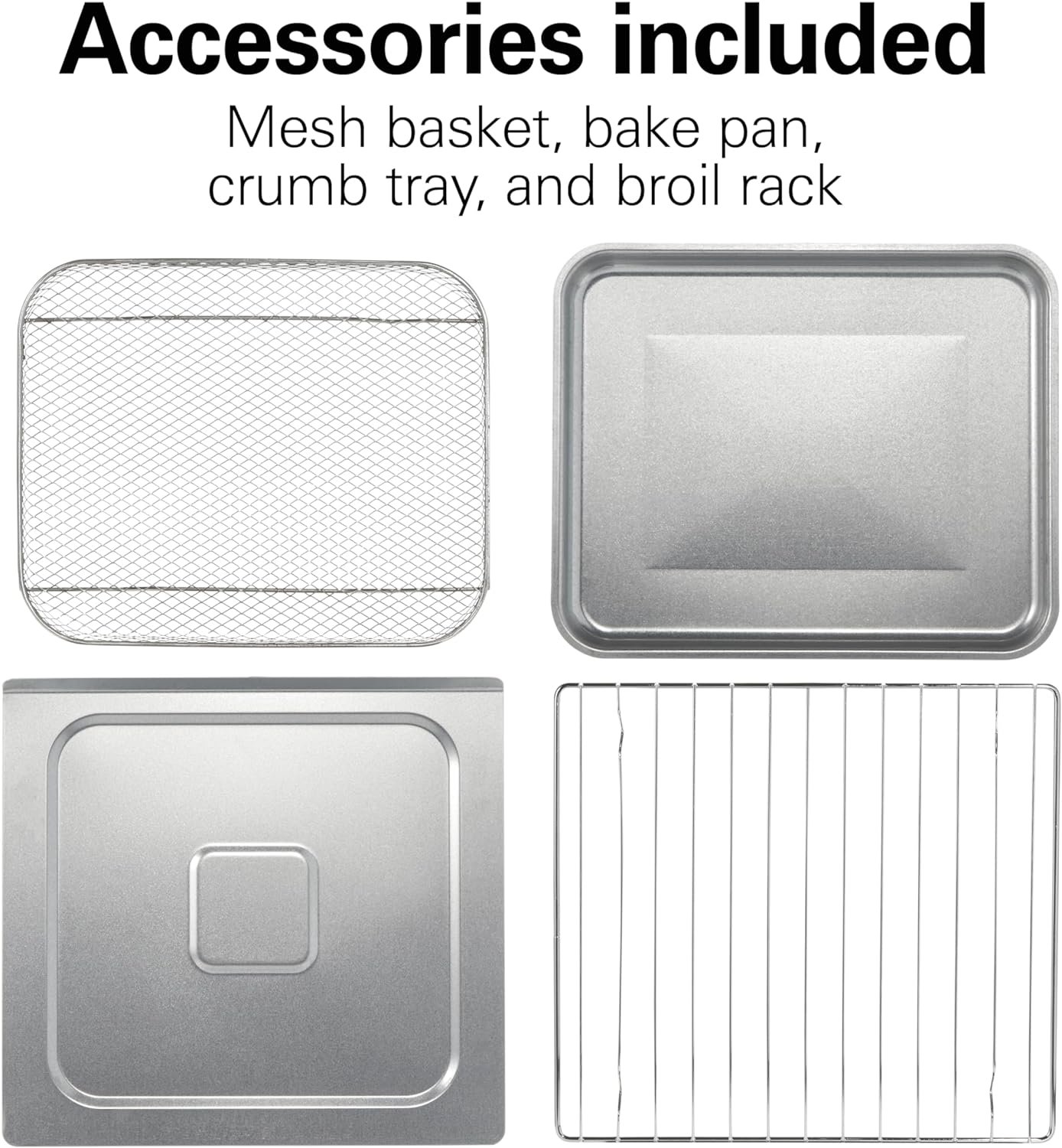 INCLUDES ACCESSORIES: The air fryer toaster oven has 2 rack positions and includes a metal mesh basket for even air frying, bake pan, and broil rack. The basket fits on the upper oven rack with the bake pan/broil rack below to catch drippings.