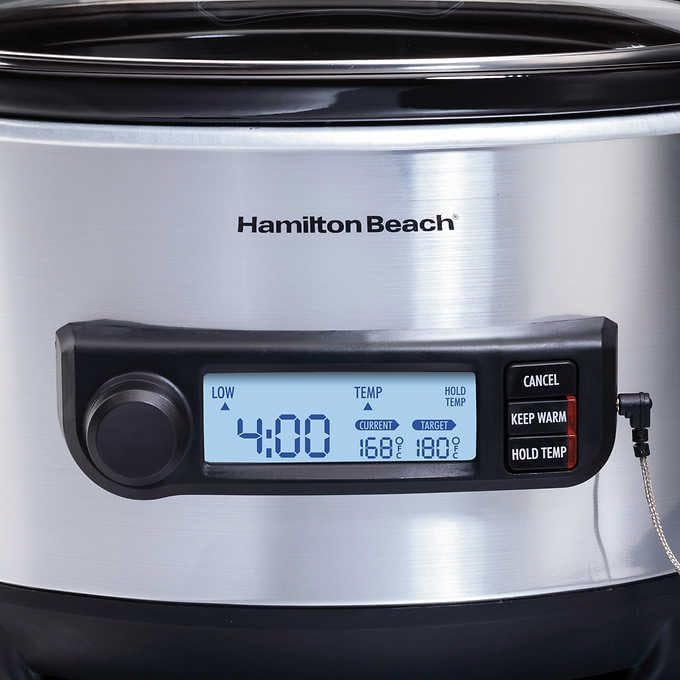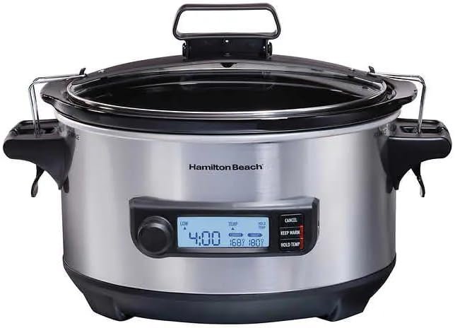 Hamilton-Beach Programmable 6 Quart Slow Cooker, a culinary powerhouse designed to simplify meal preparation and elevate your cooking experience. With its generous 6-quart capacity, this programmable slow cooker is perfect for creating hearty family meals, savory stews, and flavorful soups. Equipped with easy-to-use digital controls, you can effortlessly set the cooking time and temperature to achieve perfect results every time. The programmable feature allows you to plan your meals in advance, ensuring a hot and delicious dinner is ready when you need it. Whether you’re a busy professional or a home chef looking to save time in the kitchen, this slow cooker is a game-changer.The spacious oval-shaped stoneware crock provides ample space for large cuts of meat, vegetables, and more, allowing you to cook for a crowd or prepare meals for the entire week. The removable stoneware and glass lid are dishwasher safe, making cleanup a breeze. The cool-touch handles and sleek stainless steel exterior add a touch of modern elegance to your kitchen.