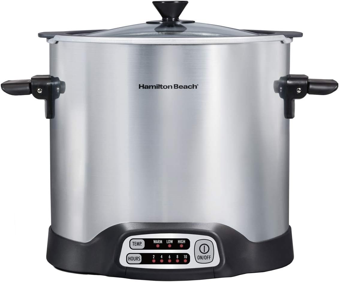 Lock in food’s flavor by searing right on your stovetop, then finish the meal in your slow cooker. The Hamilton Beach Sear & Cook Stock pot Slow Cooker has a 10 quart capacity for serving 12 or more people and it features 15 heating options.