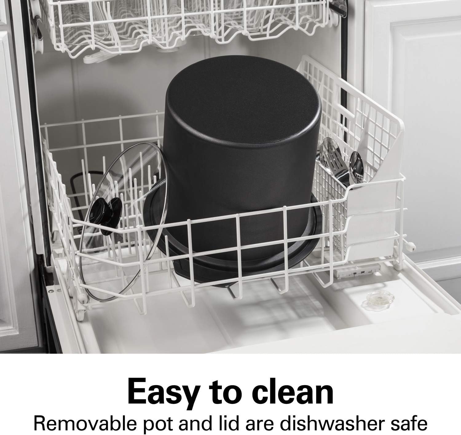 LIGHTWEIGHT REMOVABLE NONSTICK ALUMINUM POT. The lightweight removable pot is lighter than a ceramic crock, so it’s easy to lift when the pot is full.