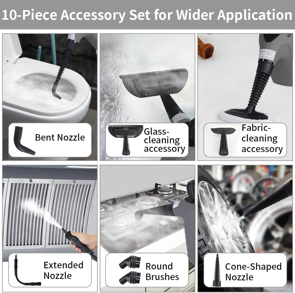 ใ๐ญ๐ฌ-๐ฝ๐ถ๐ฒ๐ฐ๐ฒ ๐๐ฐ๐ฐ๐ฒ๐๐๐ผ๐ฟ๐ ๐ฆ๐ฒ๐ใThis steamer does an amazing job of cleaning and ironing. Plus 10-piece accessory kit such as: angled nozzle, bendable extension, nozzle with brush, fabric steamer tool, rubber wiper for window/door, and many other extras. Itโs all-purpose and can go and clean out any hard to reach gaps, corners, angles, and also various surfaces/materials: kitchen sink, countertop, BBQ grill, toilet, floor, kidsโ toy, pet mattress, car, sofa, and clothing.