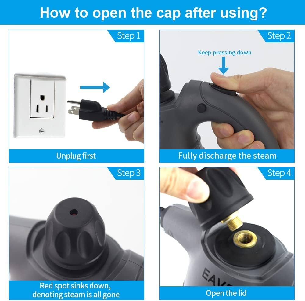 After use, the temperature of the residual steam inside the tank is still too high, please: 1.Unplug first 2. Fully discharge the residual steam 3. Open the lid 4. Add water into the steamer.