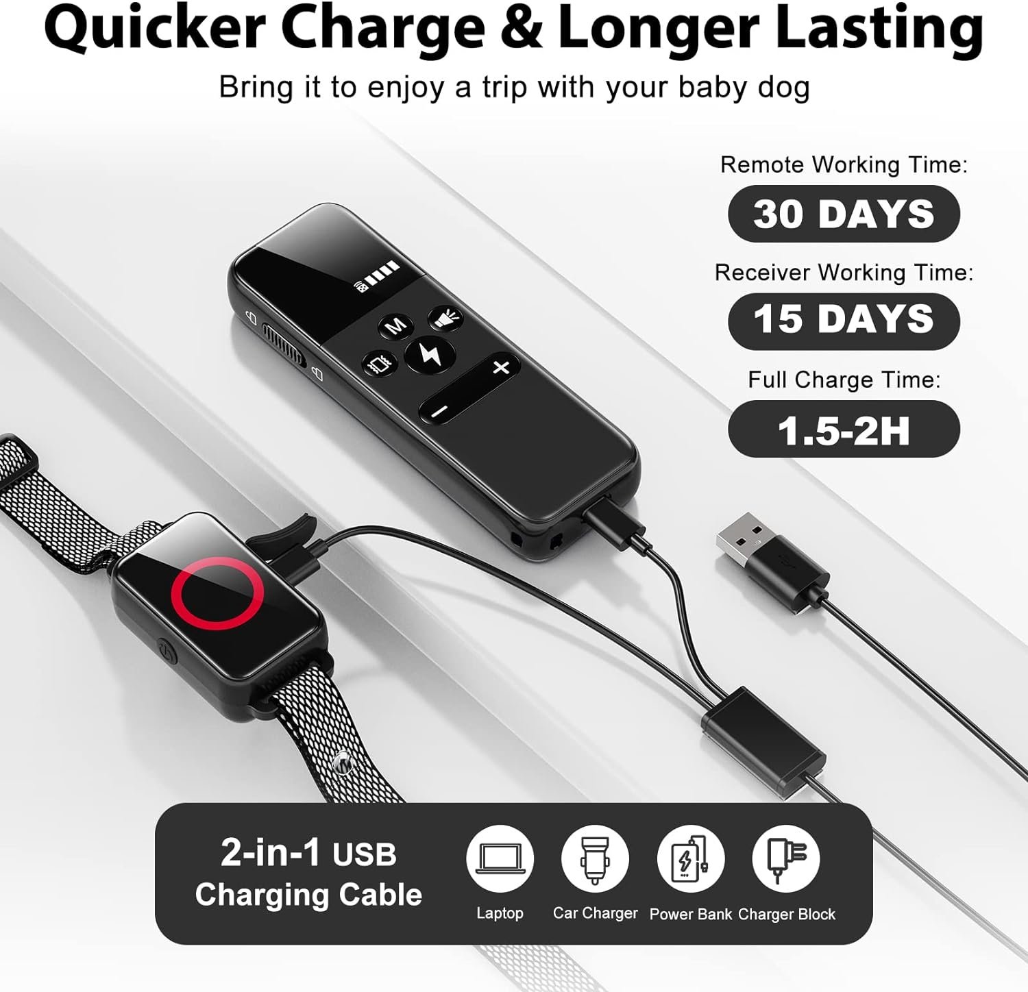 【Quicker Charging & Longer Lasting Battery】Our dog shock collar with remote can be fully charged in just 1.5-2 hours using your phone adapter, USB outlet of your PC, power bank, or car. Plus, the receiver can last up to 15 days, and the remote can last up to 30 days on a single charge (Note: charging cord included, block not included).