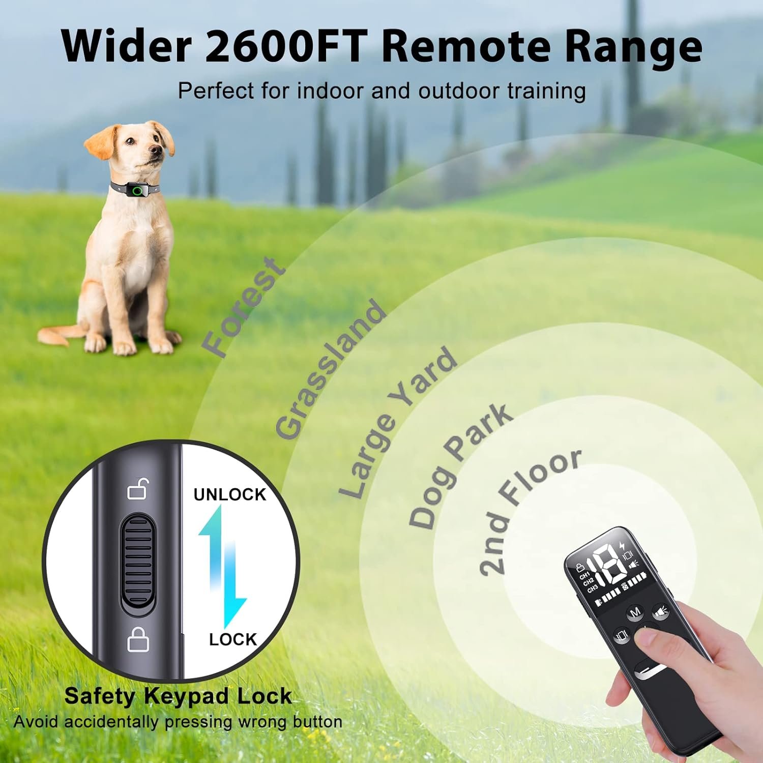 【Security Lock & 2600ft Remote Range】Our shock collar for large dog is designed with a security keypad lock to prevent accidental zaps or unwanted corrections. With an ultra-wide range of 2600ft, you can easily train your dog indoors or outdoors.