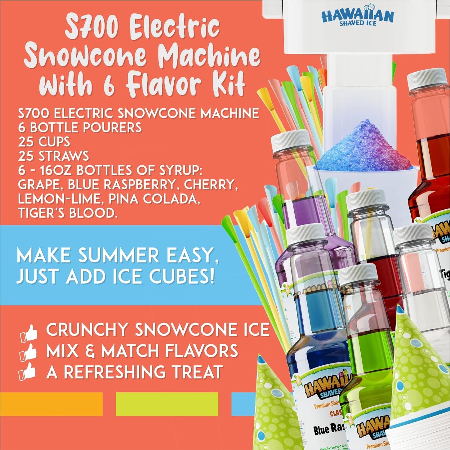Use with homemade cube ice or store-bought bagged ice. Set includes all the supplies needed to get the party started – machine, 6 – 16oz. plastic syrup bottles with red Cherry, Grape, Blue Raspberry, Tiger’s Blood, Lemon-Lime, Pina Colada flavors, plus accessories: 25 snow cone cups, 25 spoon straws, and 6 black bottle pourers. Keep a bag of ice cubes in your freezer for snowcone emergencies