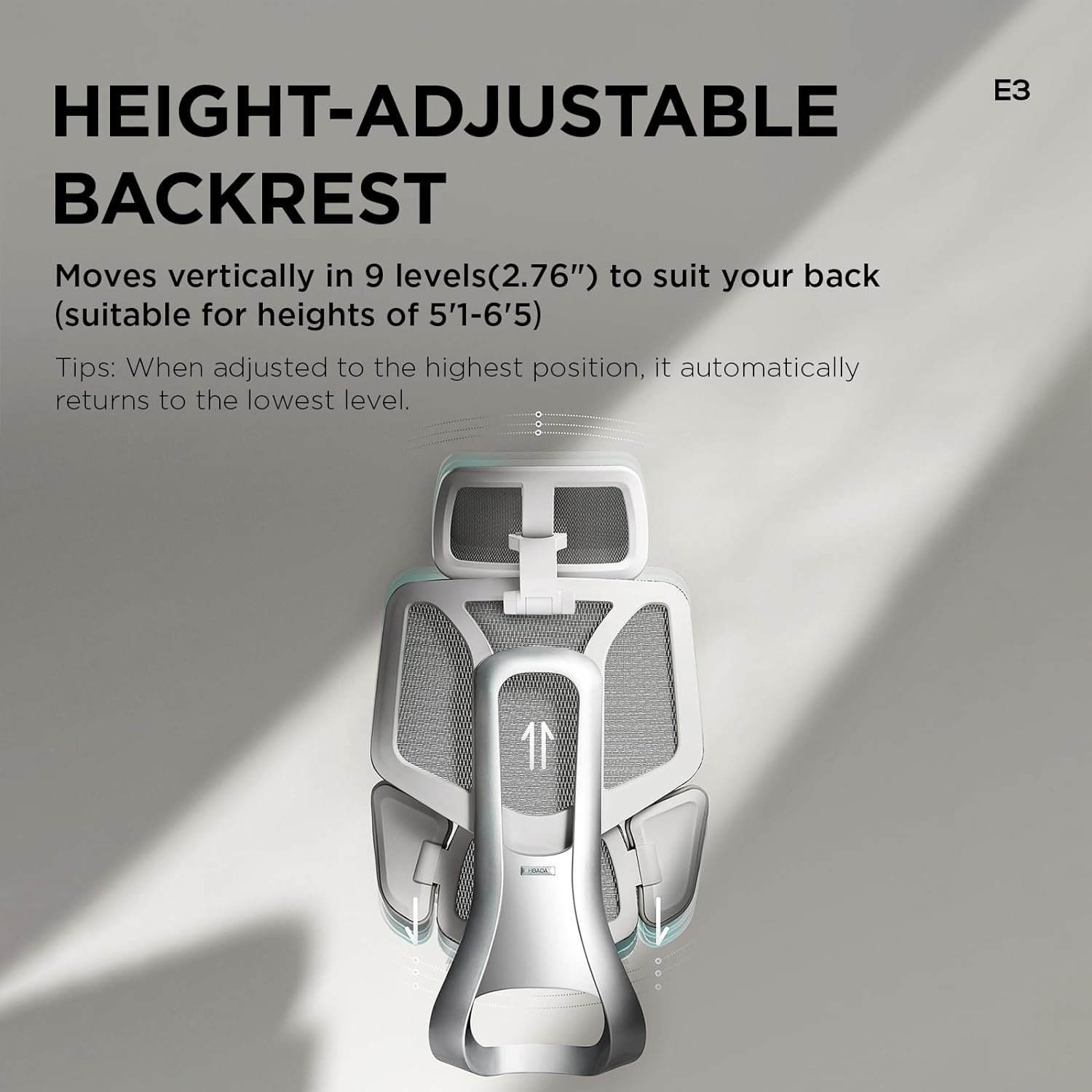 【T-Shape Support System】This ergonomic chair’s T-Shape Support System is originally created by Hbada. It solves the discomfort caused by the “3 kinds of hurts resulted from long-time sitting” by supporting the [neck – waist – shoulder]. The liftable backrest has a nine-position adjustment, allowing for 2.76″ of up and down movement, making it suitable for individuals of varying heights. When adjusted to the highest position, it automatically returns to the lowest level.(Headrest and lumbar support also adopt this cycle gear adjustment.)