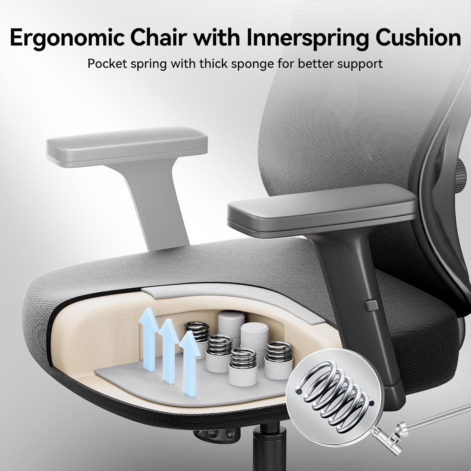 【Comfort & Ventilated】 This office chair is comprised of a cushion with a 3.54-inch spring, memory foam, curved wooden boards, and black mesh covering. It has 16 independent springs and a 1.18-inch memory foam with just the right softness to maintain its shape even after extended use, and is as relaxing as a sofa. The breathable mesh fabric prevents sweating after prolonged sitting. The soft and highly flexible cushion spring will provide you lasting support through long periods of sitting.