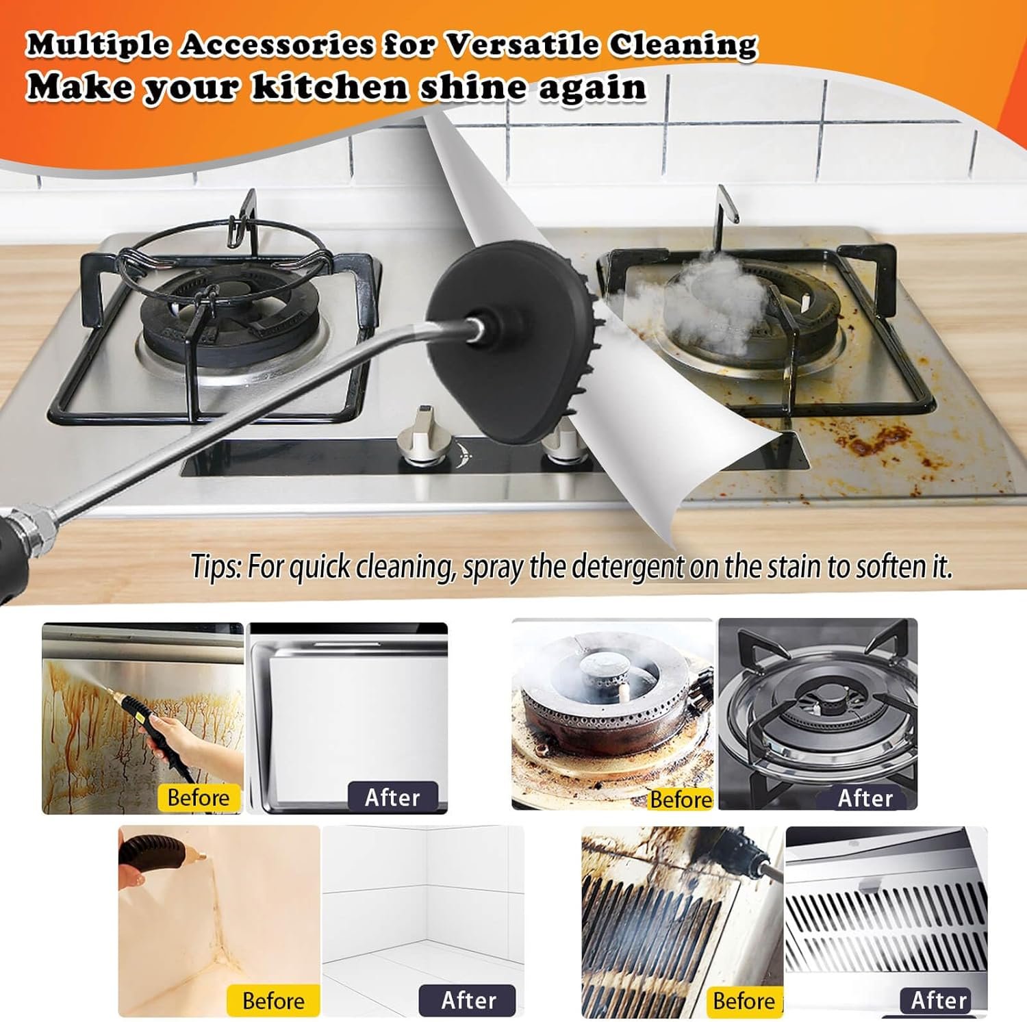 🎅🎅【Extended Nozzle & Three Different Brush Heads】 Comes with an extended nozzle, you do not need to carry the water tank all the time. Overall weighing less than 4lbs.mini size with light weight. 🎅🎅 With 3 different brush heads, the High Pressure steamer can not only be used to clean the kitchen, clean the wall, stove, smoke, microwave oven, washing machine, refrigerator, car and carpet, but also be widely used in kitchen, bathroom, furniture, car and so on.