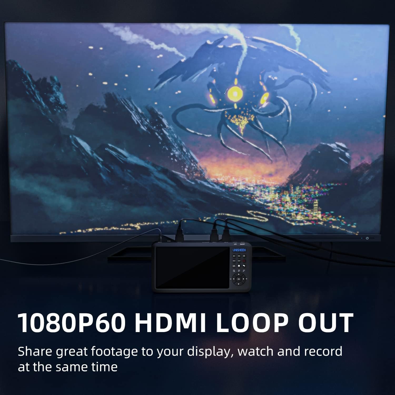 UNISHEEN UR500 video recorder support 2-channel HDMI input picture-in-picture Video Capture box with 7 inches Screen, recording format MP4. Support SD Card/USB Drive , 1080p 60 FPS video camera guide storage, Comes wit USB2.0 Cable, remote control, support F550/F750/F970 batteries.