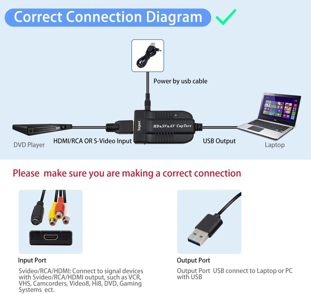 With Female HDMI, AV, and S-Video input video sources(need extra buy HDMI, AV, and S-Video Cable.),male usb 2.0 output(Works with Laptops and Desktops)