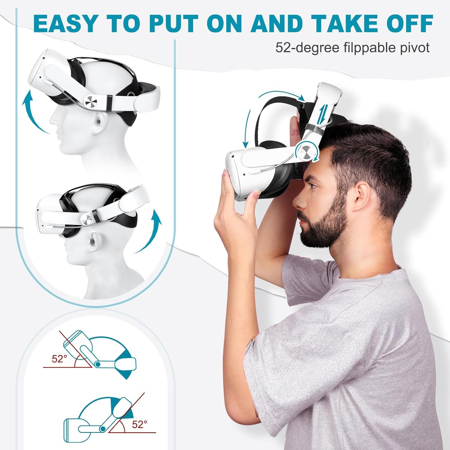 Improved Side Straps: Our elite strap with battery is made of durable and sturdy eco-friendly upgraded nylon PA material. The side strap that can bend up to 10,0000+ times, no longer worry about side strap damage. And a 52° adjustable hinge design allows for effortless wearing and taking off by lifting the VR headset up slightly.
