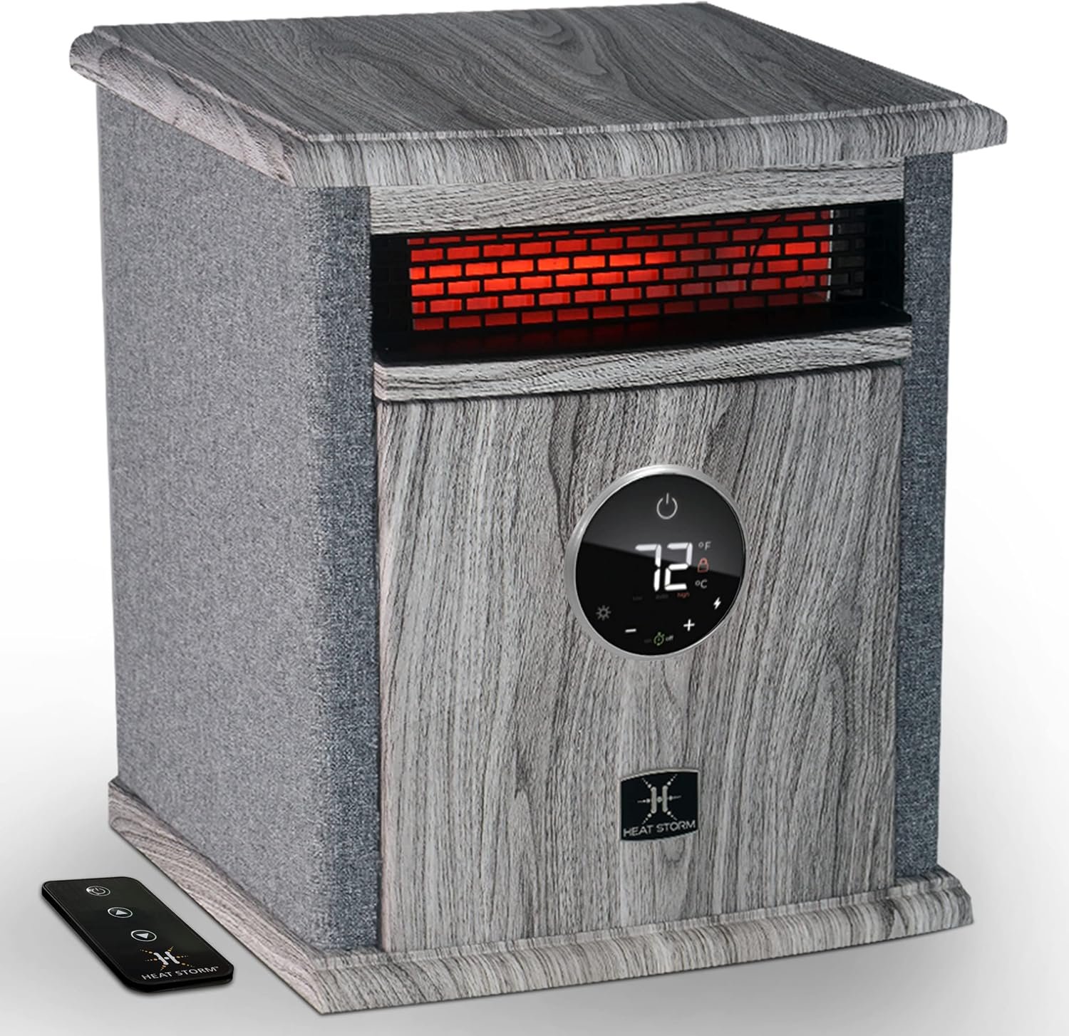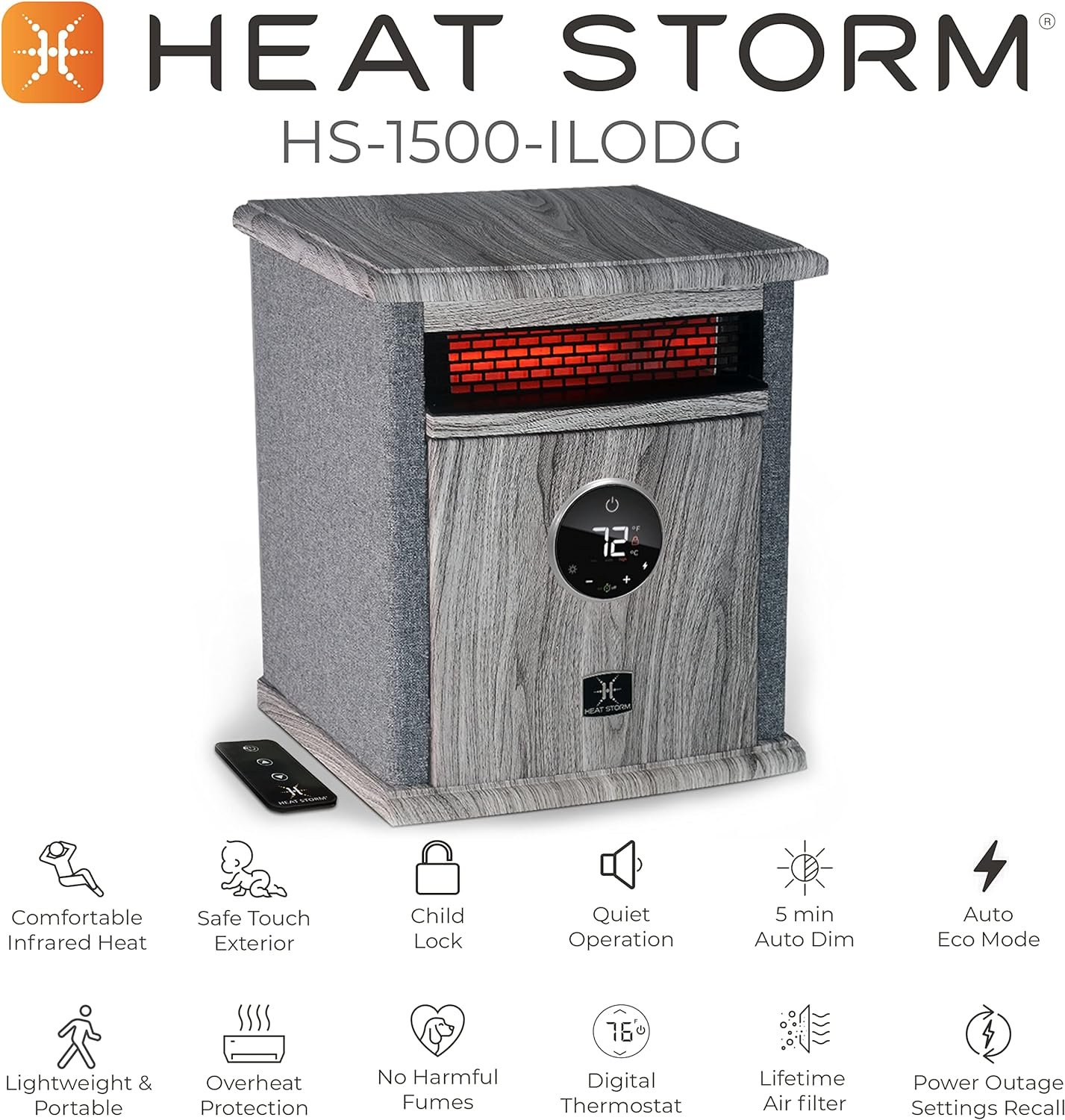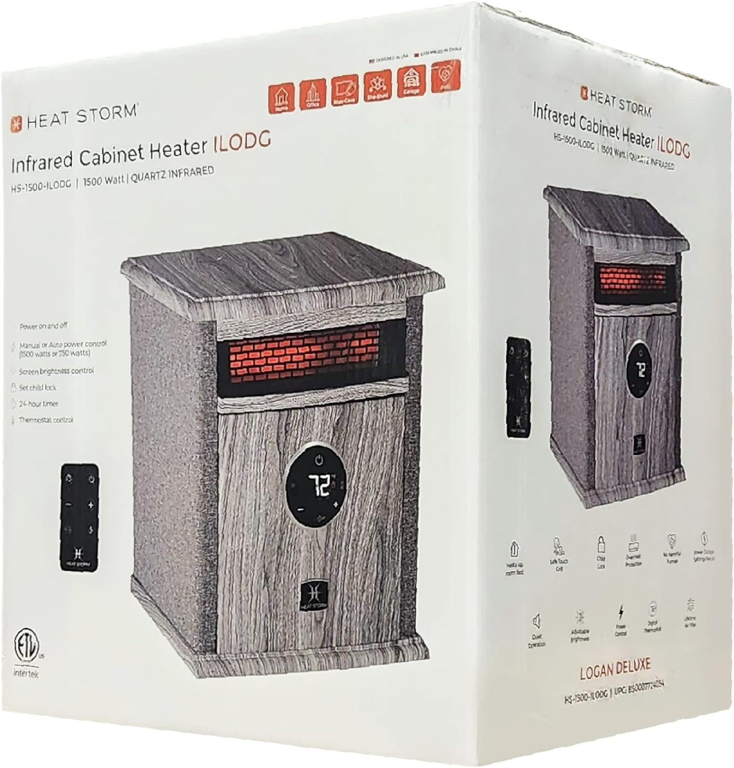 Tired of your old-looking heater in your basement? The Logan Deluxe Portable Infrared Quartz Heater has a space-saving design and is ultra-efficient for a medium-large room. This heater features four of our quartz infrared elements that are encased in our Patent HMS Technology. Our HMS Technology is a double wall heat exchanger that provides better safety features than our competitors by creating a safer heating environment for you. Simply put, you get better heat, quicker delivery, faster heating and runs more efficiently all of which save you money. All electrical components are warrantied for 1-year. There is a lifetime washable air filter. An Eco Setting will reduce the wattage from 1,500 to 750 creating less power consumption. The heater is surrounded by our stylish wood cabinet with a black front that is cool to the touch. Casters are included to make moving the heater from room to room easily. This amazing heater also includes a remote control to operate the Digital Thermostat allowing you ultimate control.