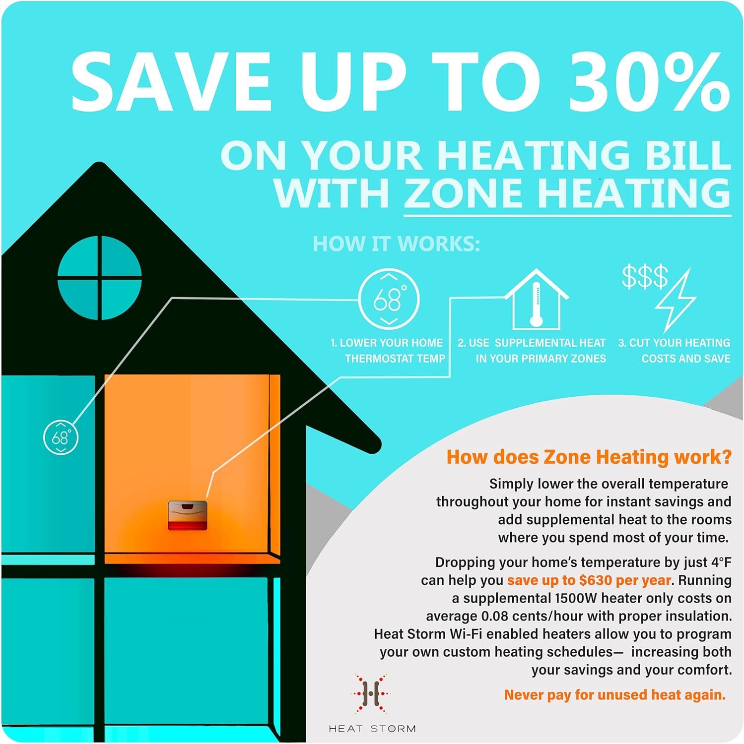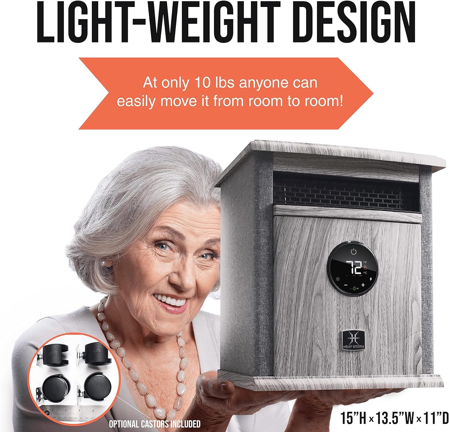 Small convenient size makes this perfect for any room in the house. Optional casters make it easy for you to move from room to room or wherever you may need some extra heat. Energy-Efficient mode reduces the wattage from 1500 to 750.