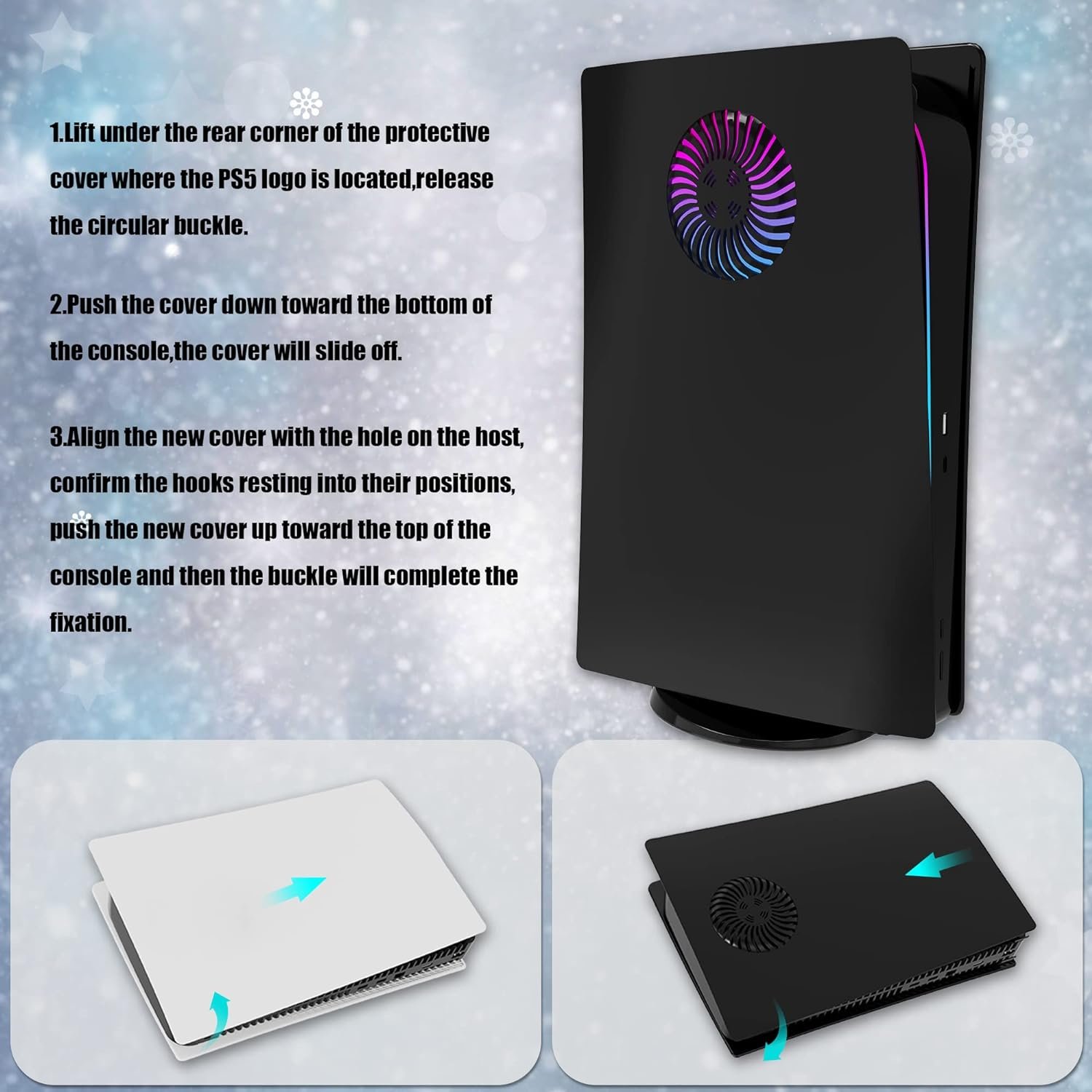 [Easy Installation]: Replacing your PS5 faceplate is quick and easy. Just follow these three simple steps: lift the rear corner of the protective cover, release the circular buckle, and slide off the old cover. Align the new cover with the hole on the console, confirm the hooks are in place, and slide the new cover up and secure it with the buckle.