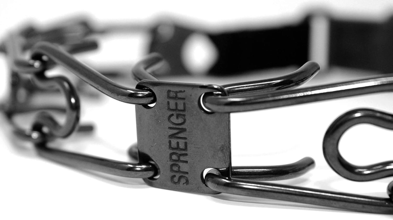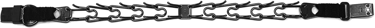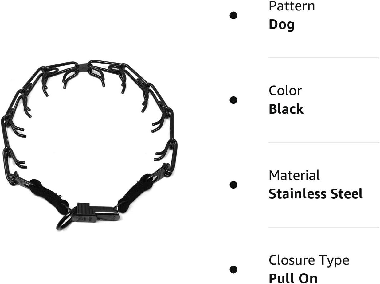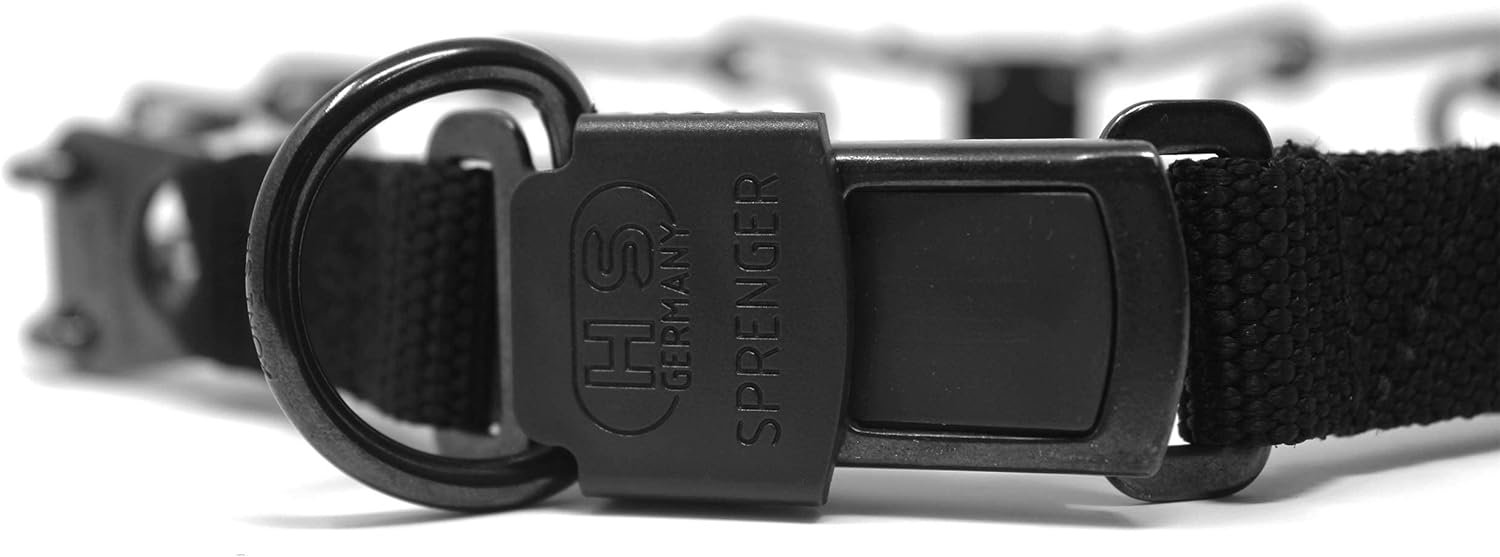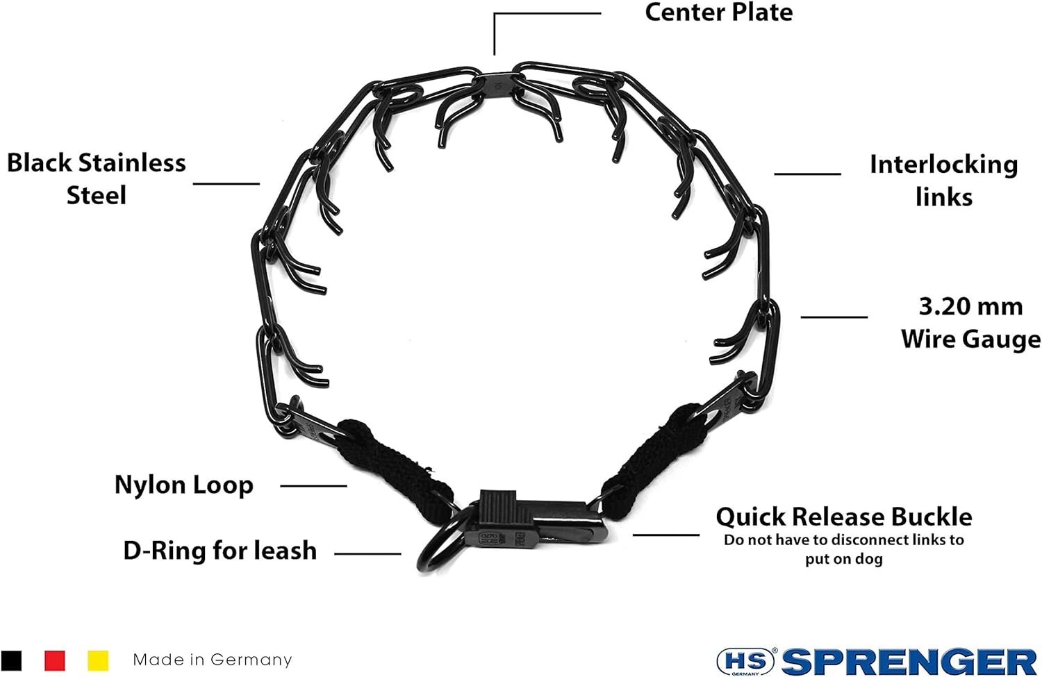 The Herm Sprenger Black Stainless Steel Training collar is one of the most recognizable and popular names in obedience training tools. A safe and effective alternative to choker collars, it puts even pressure around the neck, about every half inch, pushing the skin in a band. This collar does not apply direct pressure to the trachea, so you can train your dog with little or no tugging, jerking, or pulling. The addition of a center plate connector allows the middle link to be configured symmetrically, enabling the links to tighten in the same direction. Made of high quality German Black stainless steel, the size of this collar can be adjusted by adding or removing the links individually. Features: interlocking links, each link equipped with two blunt link tips slips over dog’s head for easy on, easy off slightly beveled link tips easy to increase or decrease in size Made of high quality Black stainless steel Additional links sold separately. Sizing instructions: collar should fit snuggly just below the dog’s ears, measure the circumference of dog’s neck and add 2″. These Black Stainless steel collars with ClicLock quick release buckle come in three sizes 2.25mm gauge x 16 in overall length, 3.2mm gauge x 23 in overall length and 4mm gauge by 25 in overall length.