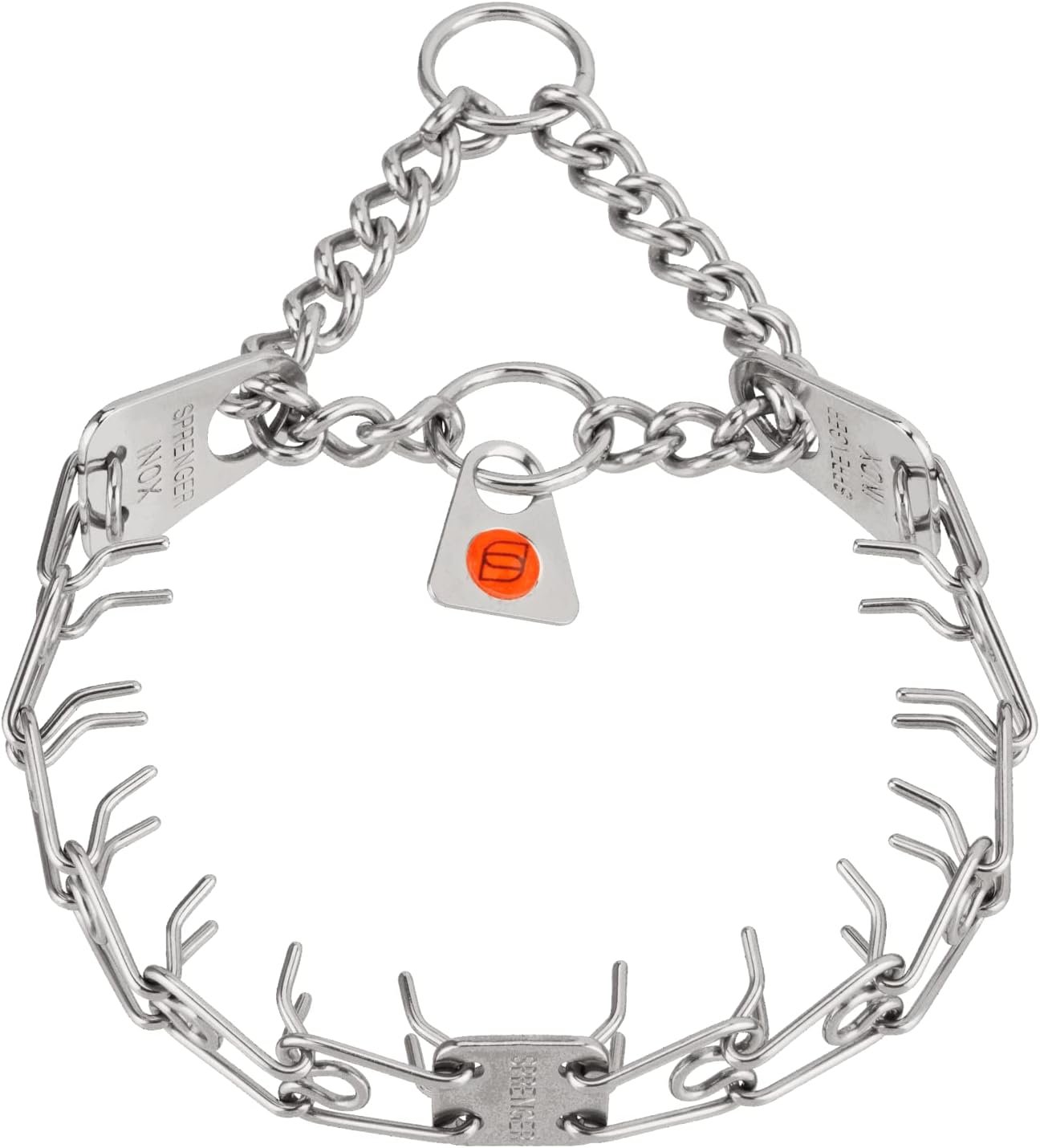 The Herm Sprenger Stainless Steel Prong collar is one of the most recognizable and popular names in obedience training tools. A safe and effective alternative to choker collars, it puts even pressure around the neck, about every half inch, pinching the skin in a band. This collar does not apply direct pressure to the trachea, so you can train your dog with little or no tugging, jerking, or pulling. The addition of a center plate connector allows the middle link to be configured symmetrically, enabling the prongs to tighten in the same direction. Made of high quality German stainless steel, the size of this collar can be adjusted by adding or removing the links individually. Features: interlocking links, each link equipped with two blunt prongs slips over dog’s head for easy on, easy off slightly beveled prong tips easy to increase or decrease in size Made of high quality stainless steel Additional links sold separately. Sizing instructions: collar should fit snuggly just below the dog’s ears, measure the circumference of dog’s neck and add 3 inches. These Stainless steel collars with O ring come in three sizes 2.25mm gauge x 16 in overall length, 3.2mm gauge x 23 in overall length and 4mm gauge by 25 in overall length