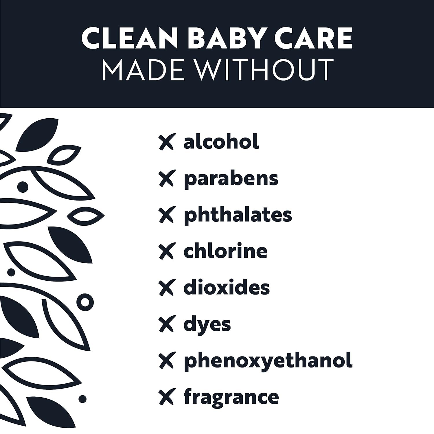 CLEAN BABY CARE: SAFE & GENTLE ON BABIES’ SKIN. NO alcohol, chlorine, dioxides, dyes, parabens, phthalates, phenoxyethanol or fragrances.