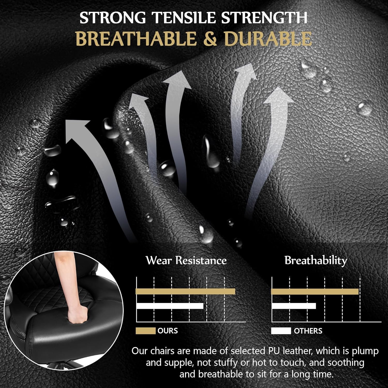 【Breathable Leather Office Chair】Made of premium quality PU leather with a diamond pattern that promotes air circulation, this large size computer chair is extremely breathable and lasting. Our leather material resists scratches, stains, and cracks, is easy to clean, and provides a longer service life.