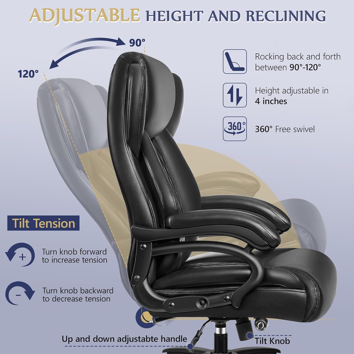 【Multi-Functional Leather Desk Chair】Wide seat leather office chair features 360° free swivel, 3″ height adjustable mechanism and 30° backrest angle and tilt/rocking function. Swings back and forth at any angle up to 120°. Customize your sitting position for optimal comfort!