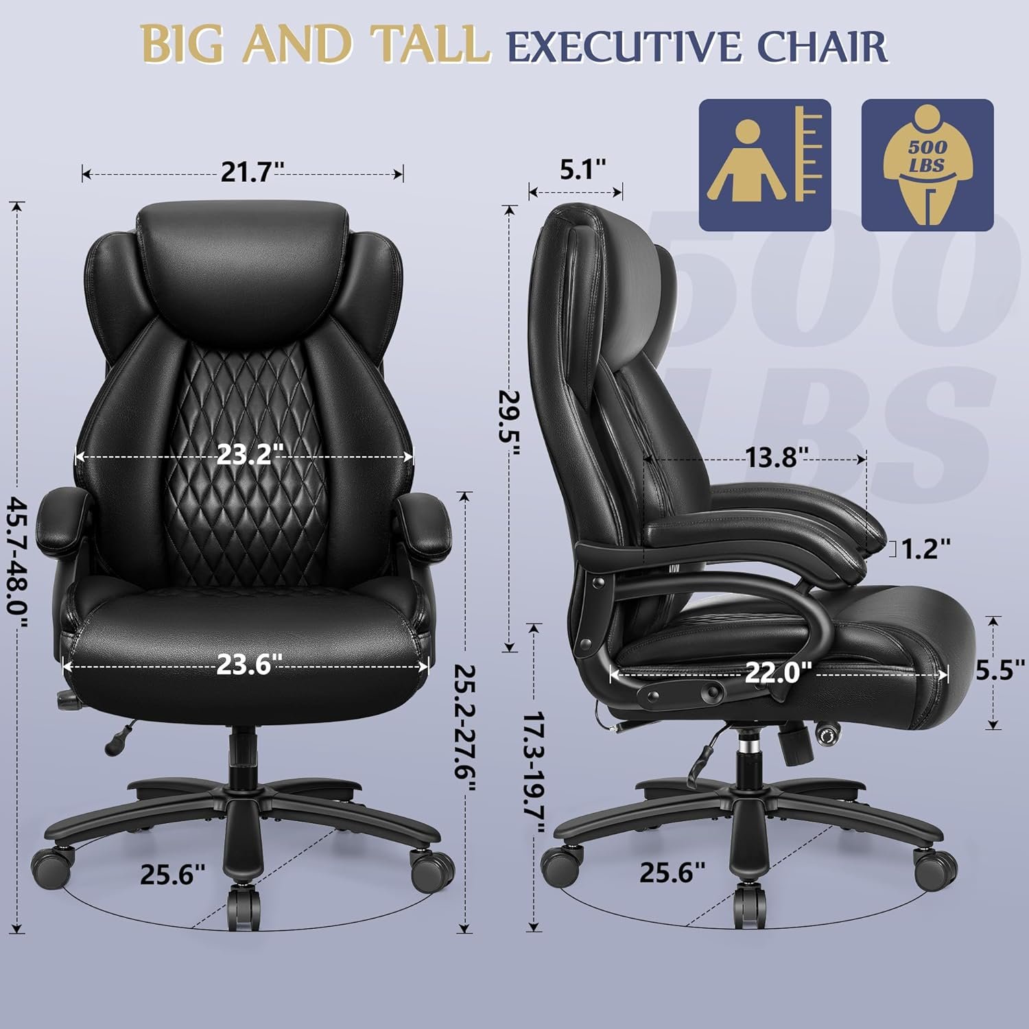 【Upgraded Heavy Duty Foot Stool & Casters】Dependable chair construction with SGS certified Class 4 gas rod, heavy duty swivel metal base with stylish looking plated foot stool, and with larger sized skateboard wheels to create a stronger weight bearing capacity up to 500lbs, which is designed for tall and heavy people.