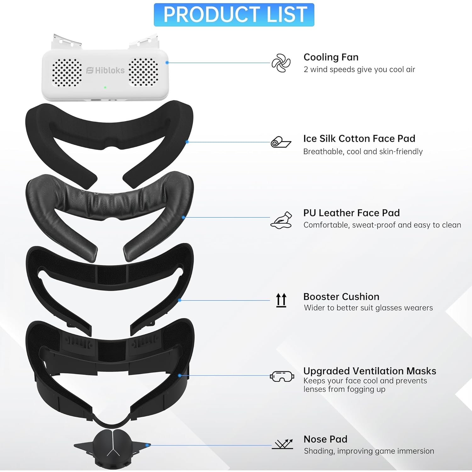 🎁🎁【What you’ll get】Breathable facial interface *1, 2-speeds cooling fan *1, breathable ice silk cotton *1, PU leather pad *1, booster cushion *1, removable silicone light-blocking nose guard*1 and HiBloks 24 hours after-sales service, if you are not Satisfied with the meta quest 3 silicone facial interface for Any Reason, please feel free to contact us, we will do our best to answer you! (Note: Not for Charging Dock)