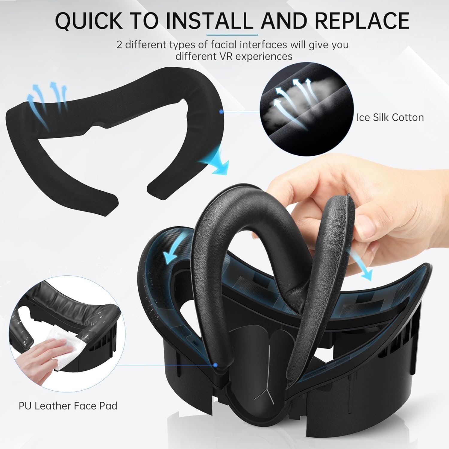 💫💫【2 Different Styles of Facial Pads】This Quest 3 facial interface includes two different face pads: Ice Silk Cotton is soft, breathable, cool and skin-friendly, PU leather is comfortable, sweat-proof and easy to clean, which can bring you a different VR gaming experience and make it convenient for you to share your Quest 3 with your family or friends. Moreover, the size is wider and thicker, with a larger contact area, effectively reducing the pressure on the head, more softer and comfortable