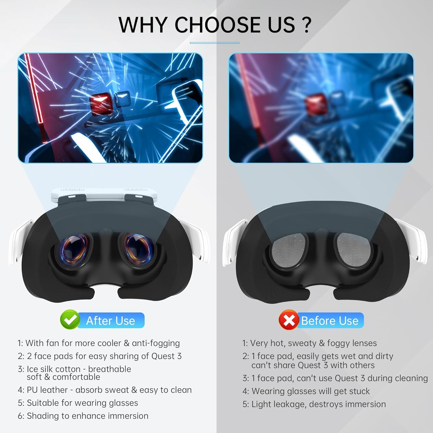 ⚡⚡【Quick to Install and Replace】All you need to do is take off the original meta quest 3 face cushion, put on ours, and finally align the Oculus Quest 3 fan with the two holes on the top and plug it in to start using. The Velcro design of the Quest 3 face cover allows you to easily remove the ice silk cotton or PU leather, so you can replace it at any time and freely choose whether to use booster cushions (professionally designed booster cushions are better suited for glasses wearers)