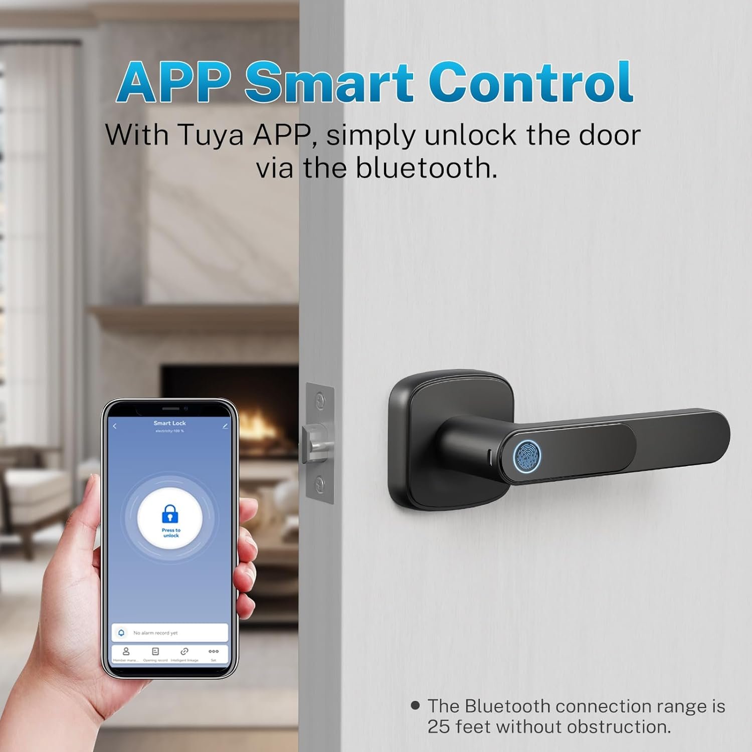 App Control with Bluetooth: The fingerprint door lock provides comprehensive App control, allowing you to unlock and lock the door, add fingerprints,etc. It is recommended to maintain a distance of up to 9m between the app and the smart door lock for optimal performance.