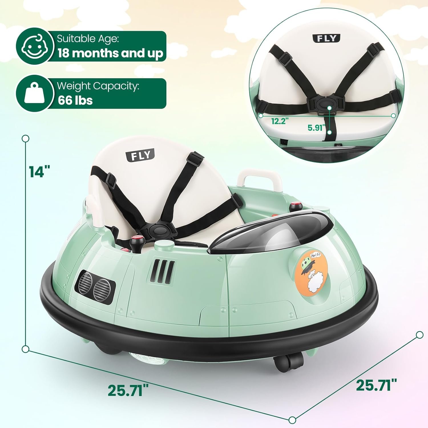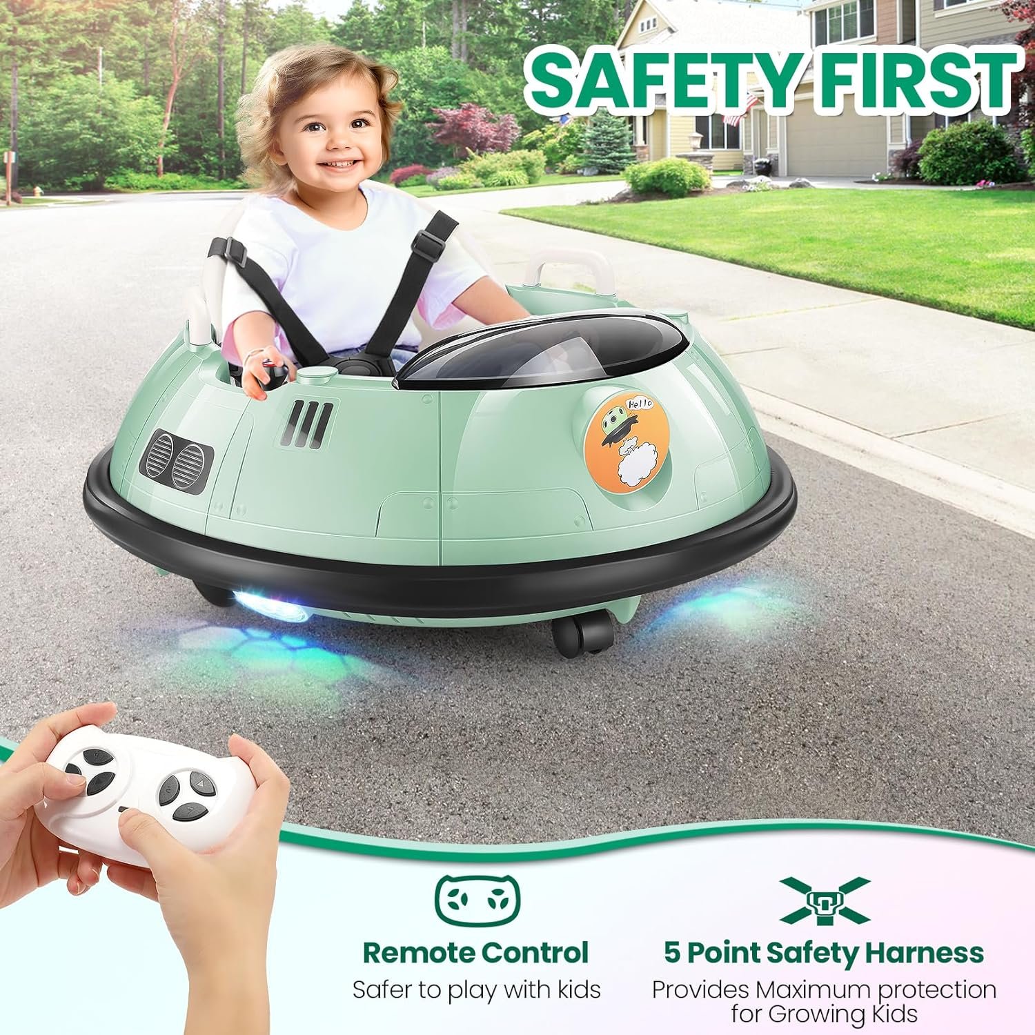 [360-Degree Spin & Flashing LED Lights] This 12v toddler bumper car features a 360-degree rotation design that allows your child to drive in all directions for more fun. Coming with the LED light, this toddler bumper car immerses your child in a world of excitement and wonder.