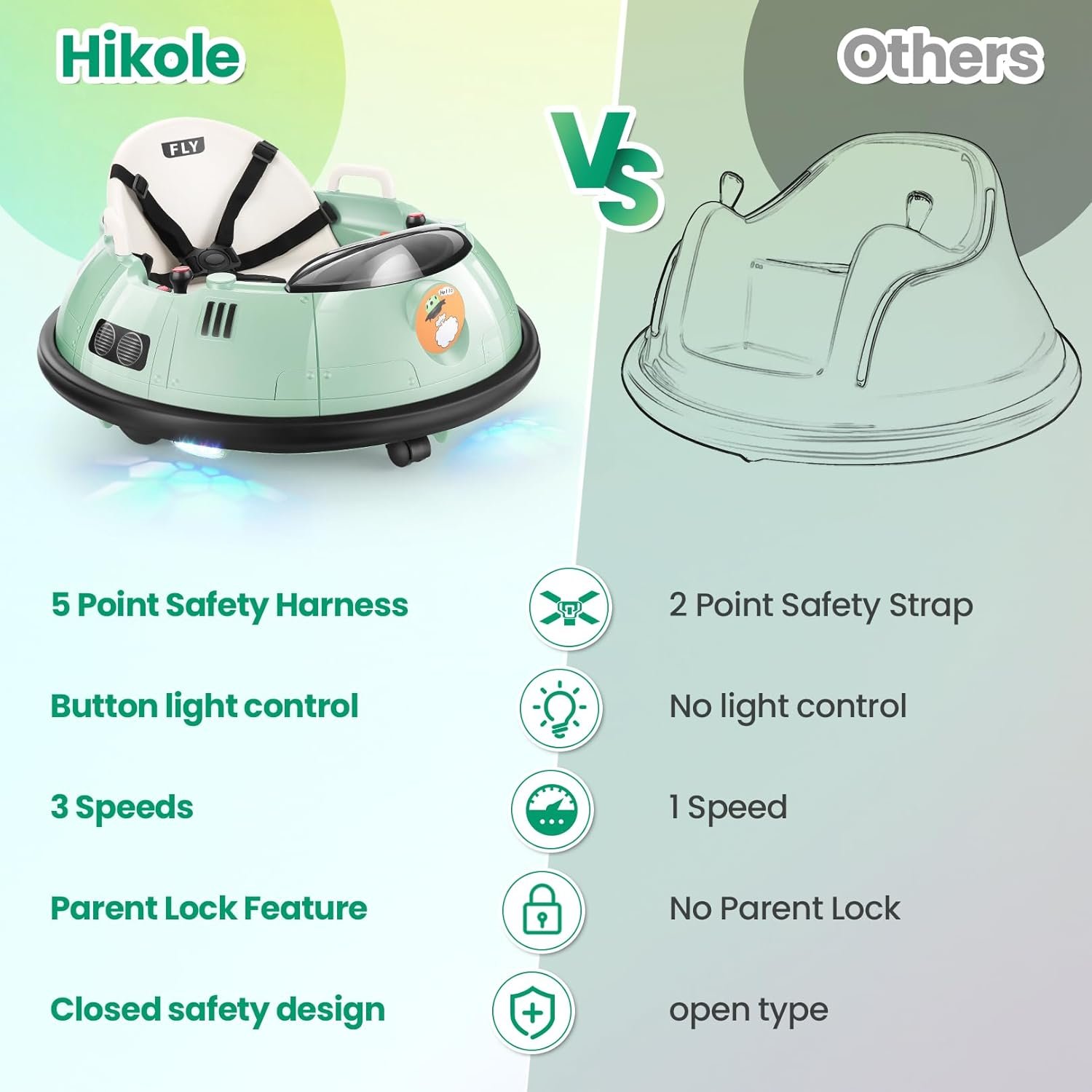 [Safe and Soft Bumper] Hikole Baby bumper car is equipped with 5-point harness and soft anti-collision strips to protect children from injuries. The ergonomic backrest, seat, adjustable safety belt, and anti-slip footrest ensure a safe and comfortable driving experience.