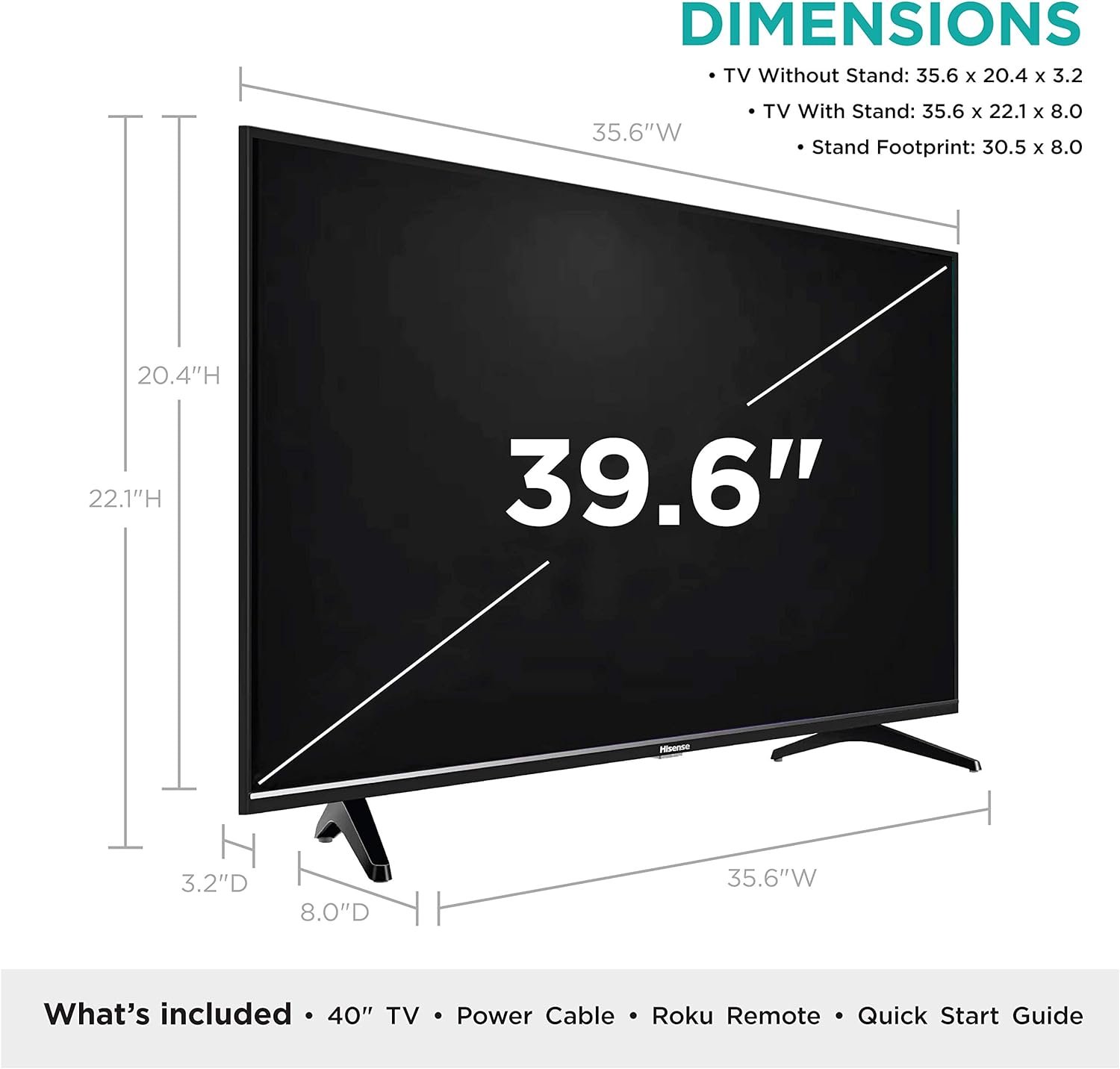 Measuring 35.6 by 20.4 by 3.2 inches (35.6 by 22.1 by 8 inches with included stand, LxWxH), the 40H4F is backed by a 1-year manufacturer’s warranty, and includes a Roku remote (batteries included), power cable, and quick start guide