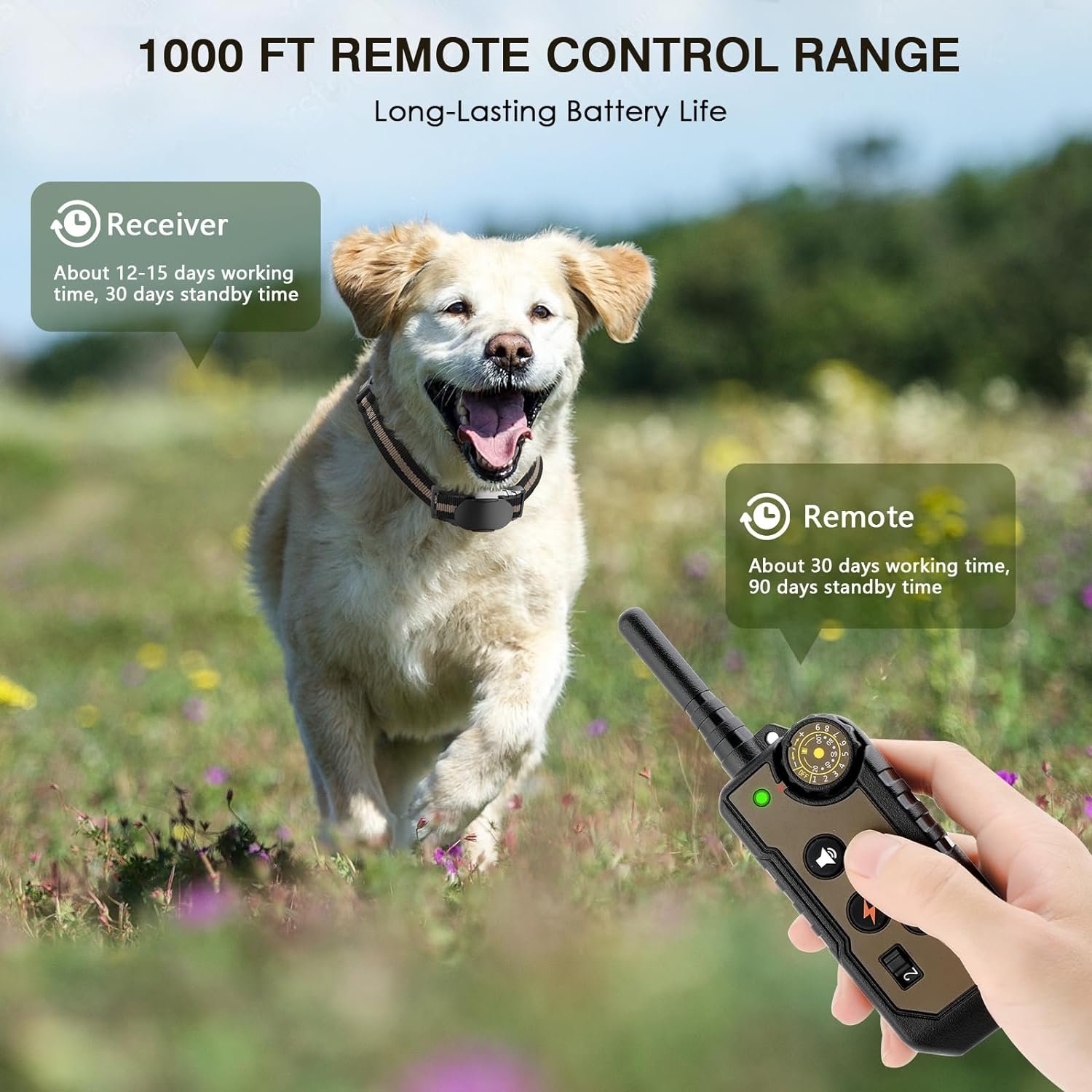 【Long Battery Life and Long Remote Range 】: Both receiver and remote are rechargeable, it takes 2-3 hours to be fully charged. The receiver’s battery can last for up to 30 days in standby time and 12-15 days in working time, and the remote can last for up to 90 days in standby time and 30 days in working time. With this dog shock collar with a remote range up to 1000ft (330 yards), you can train your dog easily both indoors and outdoors.