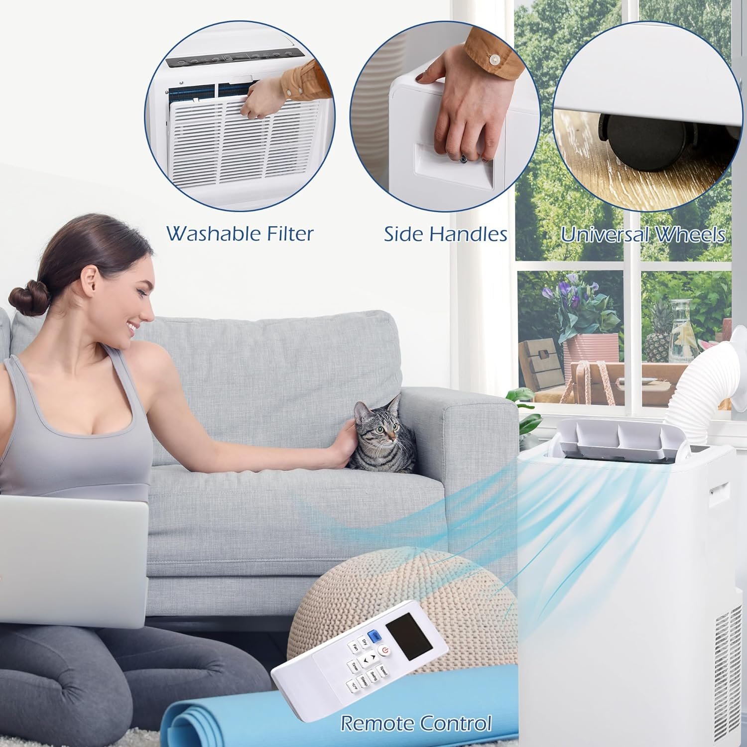 Portable Compact Design: Small but mighty, this mobile air conditioning can fit into smaller areas with ease. The four swivel wheels on the base move around easily, so you can use this portable ac unit in any room needed. The refrigerant R32 and, 12000 BTU deliver instant cooling. Fits room area: 323-549sq.ft.