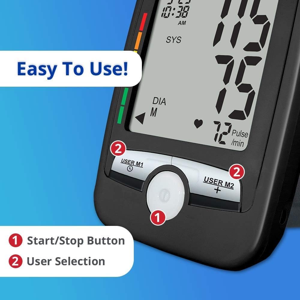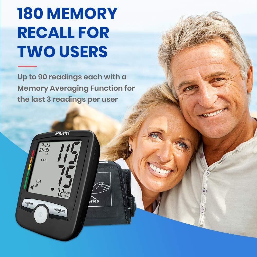 MEMORY FOR 2 – Designed to hold memory for 2 users, this portable smart blood pressure monitor stores up to 180 readings (90 per user). Additionally, each user can view their last 3 average blood pressure readings.