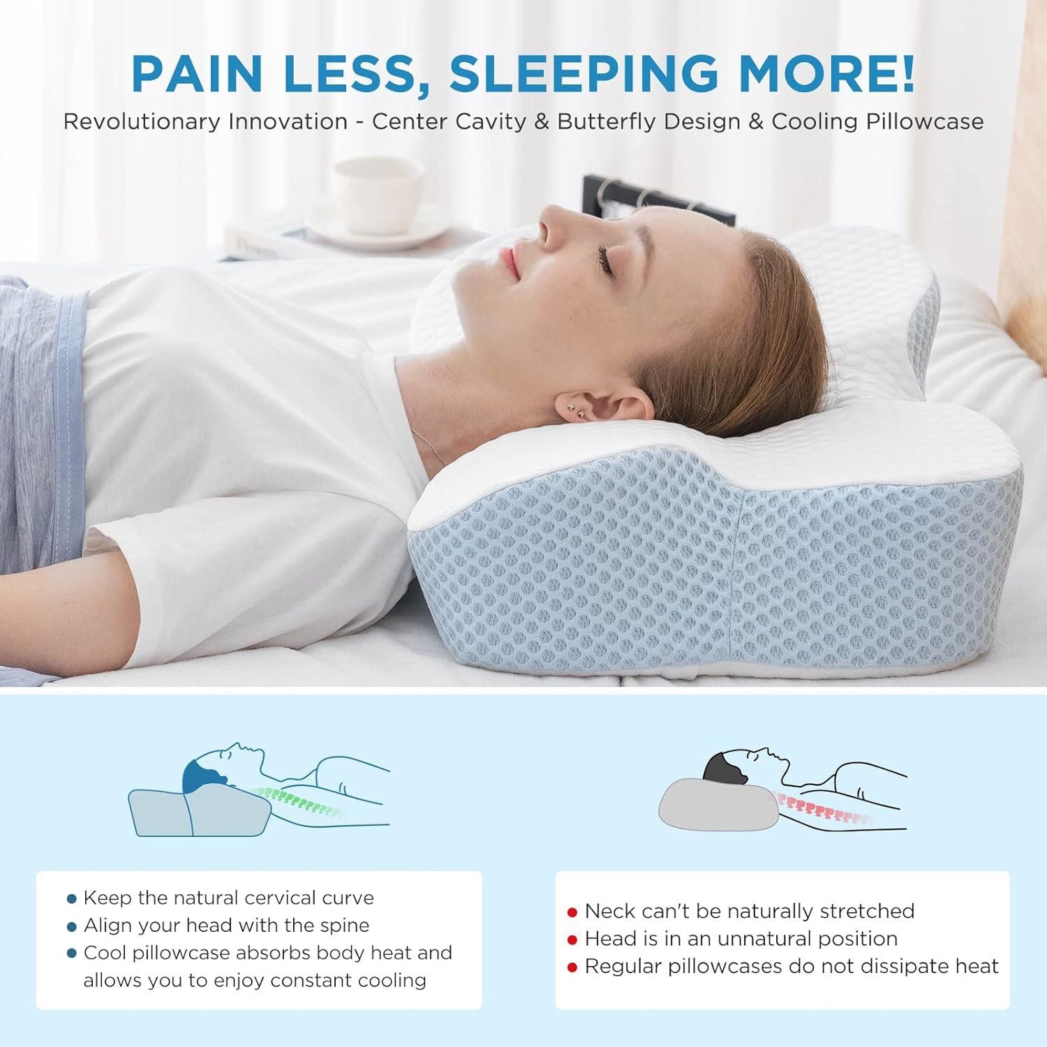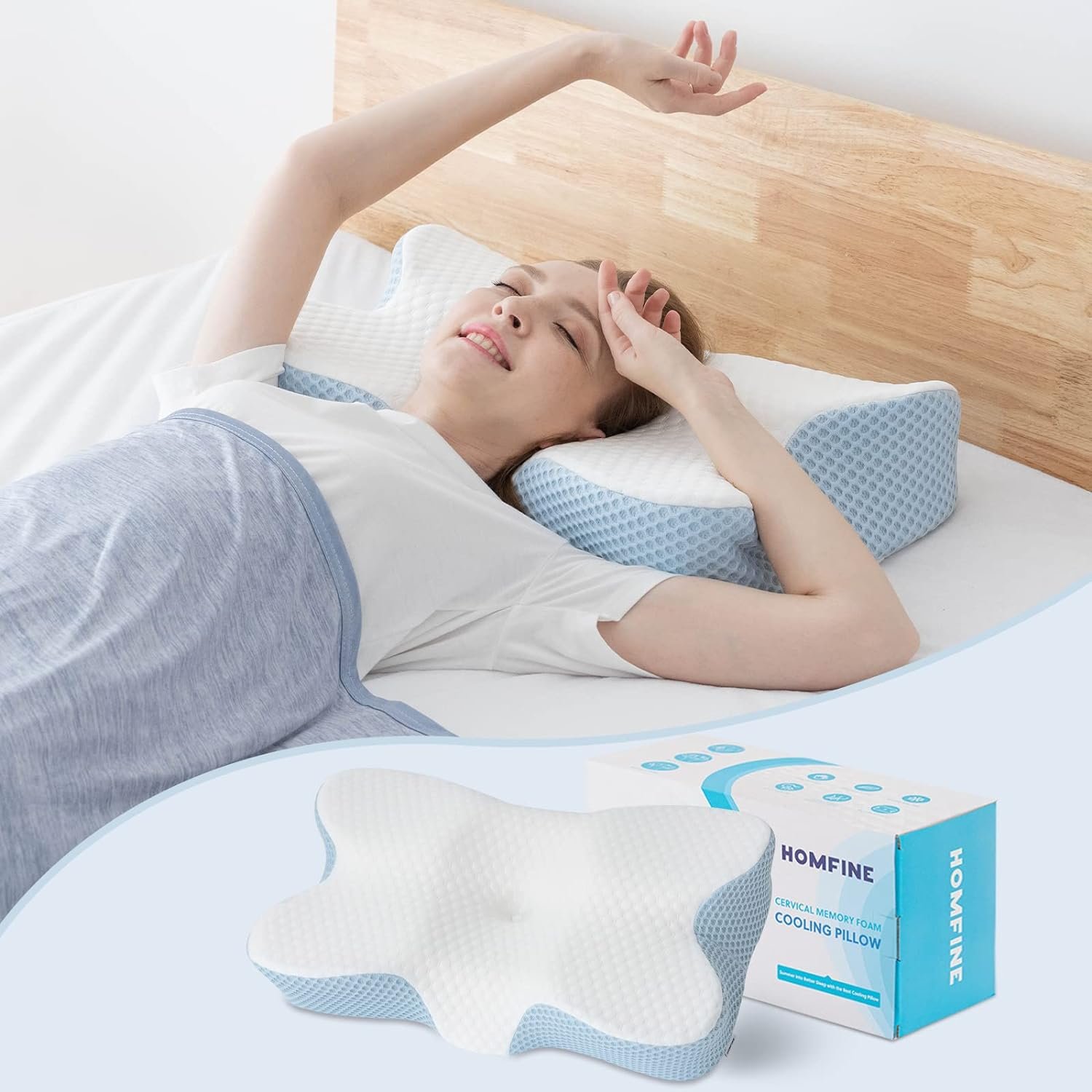 【CERVICAL MEMORY FOAM COOLING PILLOW】HOMFINE cervical neck pillow comes with a super cooling pillowcase. The cooling side is made of Japanese arc-chill cooling fibers, which can quickly absorb body heat and help you get a good night’s sleep on hot summer nights. The comfortable and skin-friendly polyester side is suitable for all seasons. The pillowcase is removable, has a zipper and is machine washable. An ideal choice for hot sleepers to combat night sweats and insomnia.