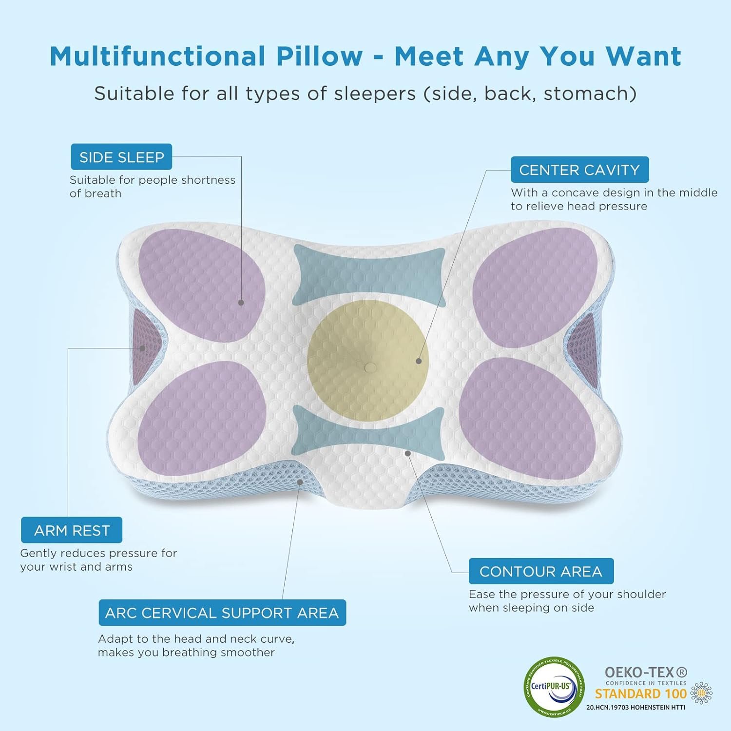 【TWO HEIGHTS AND ARMREST DESIGNS】Our cervical pillows have 2 different heights on both sides for you to choose, so you can choose the right one which is more suitable for your sleeping posture. The higher side is with 4.72” and the lower side with 3.54”(the height is for the neck). And there are specific grooves that allow your arms to go under for comfortable sleep. This orthopedic pillow is suitable for all kinds of sleeping posture,such as stomach ,back ,side sleeping.