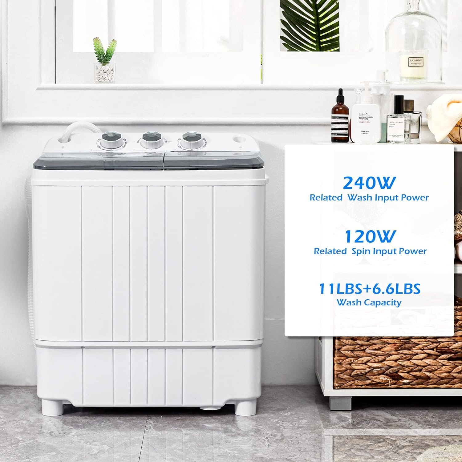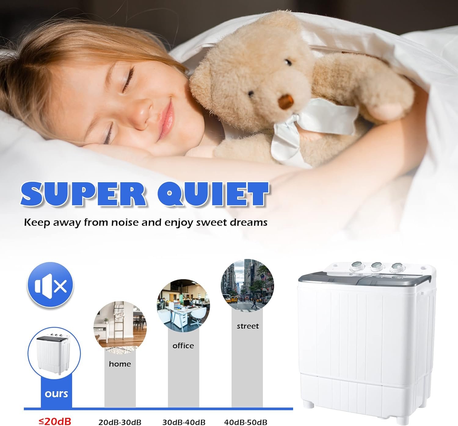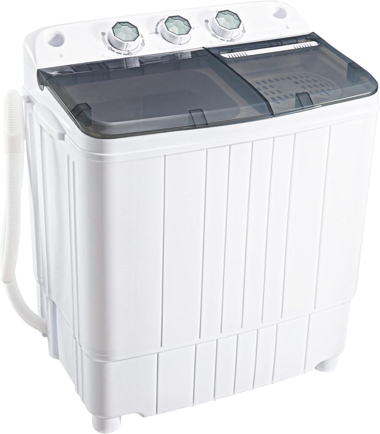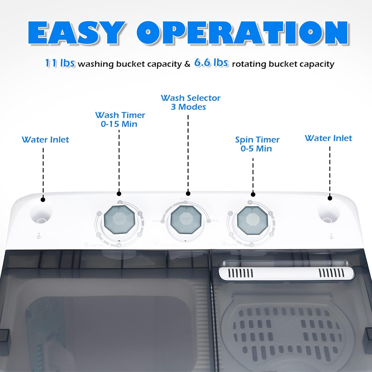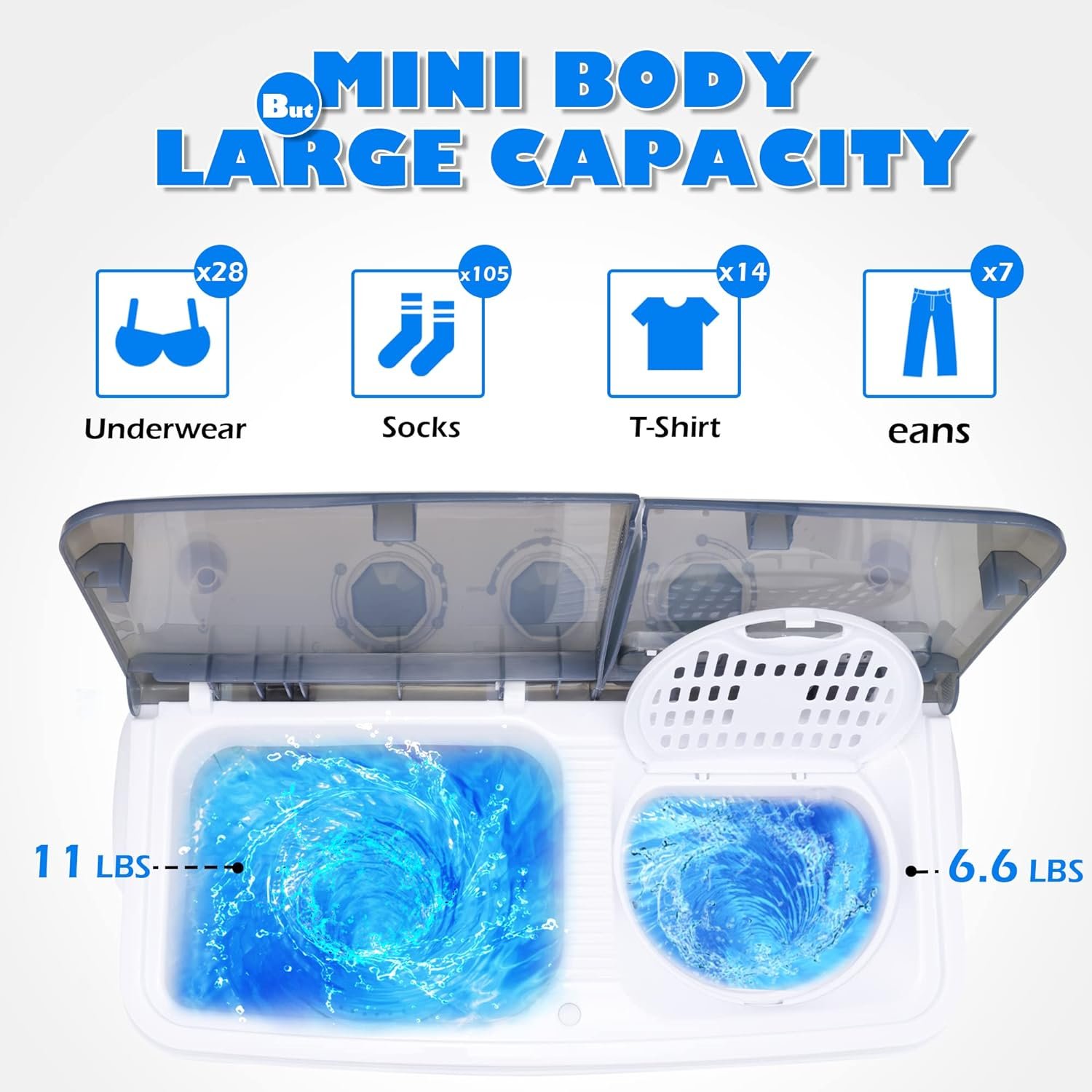 šćTwin Tub And 17.6LBS Capacityć:The portable washing machine has twin tub design for both cleaning and drying,saving your valuable time. With 11 lbs wash capacity and 6.6 lbs spin capacity,the washer is perfect for washing daily laundry quickly.Moreover, transparent cover allows you to check the washing/spinning process at any time. Constructed of High-density plastic body+ Aluminum pump+ Upgraded motor, it is well built for years use.