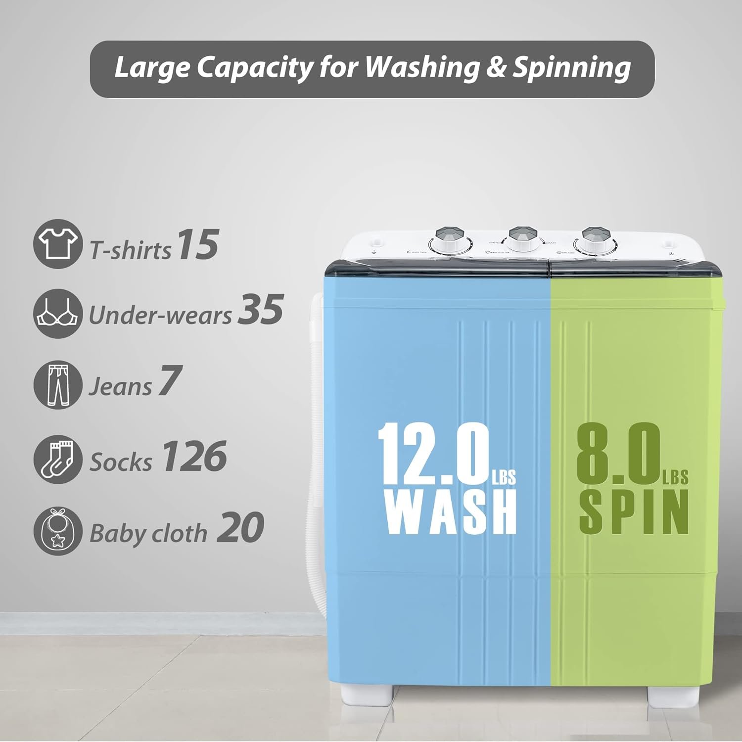【Twin Tub And 20LBS Capacity】:The washing machine has twin tub design for both cleaning and drying,saving your valuable time. With 12 lbs wash capacity and 8 lbs spin capacity,the washer is perfect for washing daily laundry quickly.Moreover, transparent cover allows you to check the washing/spinning process at any time. Constructed of High-density plastic body+ Aluminum pump+ Upgraded motor, it is well built for years use.